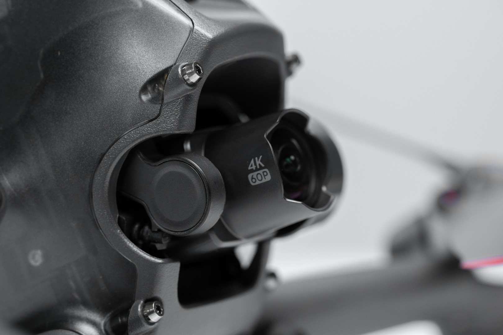 雲台部分採用單軸雲台,搭配RockSteady 增穩加持,鏡頭部分採用1/2.3"英寸CMOS感光元件,具備1200萬有效像素,飛行視角可達 150°,等效焦距為14.66m,光圈則為f2.86。以上綜合能錄製最高可 4K/60fps 影片,帶來穩定流暢的 FPV 空拍體驗。