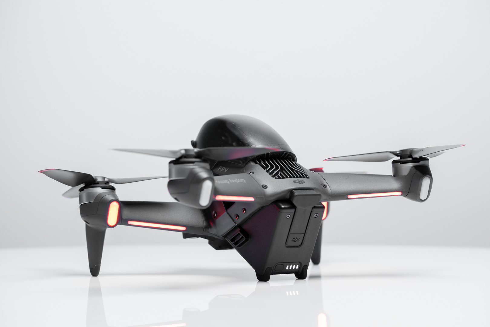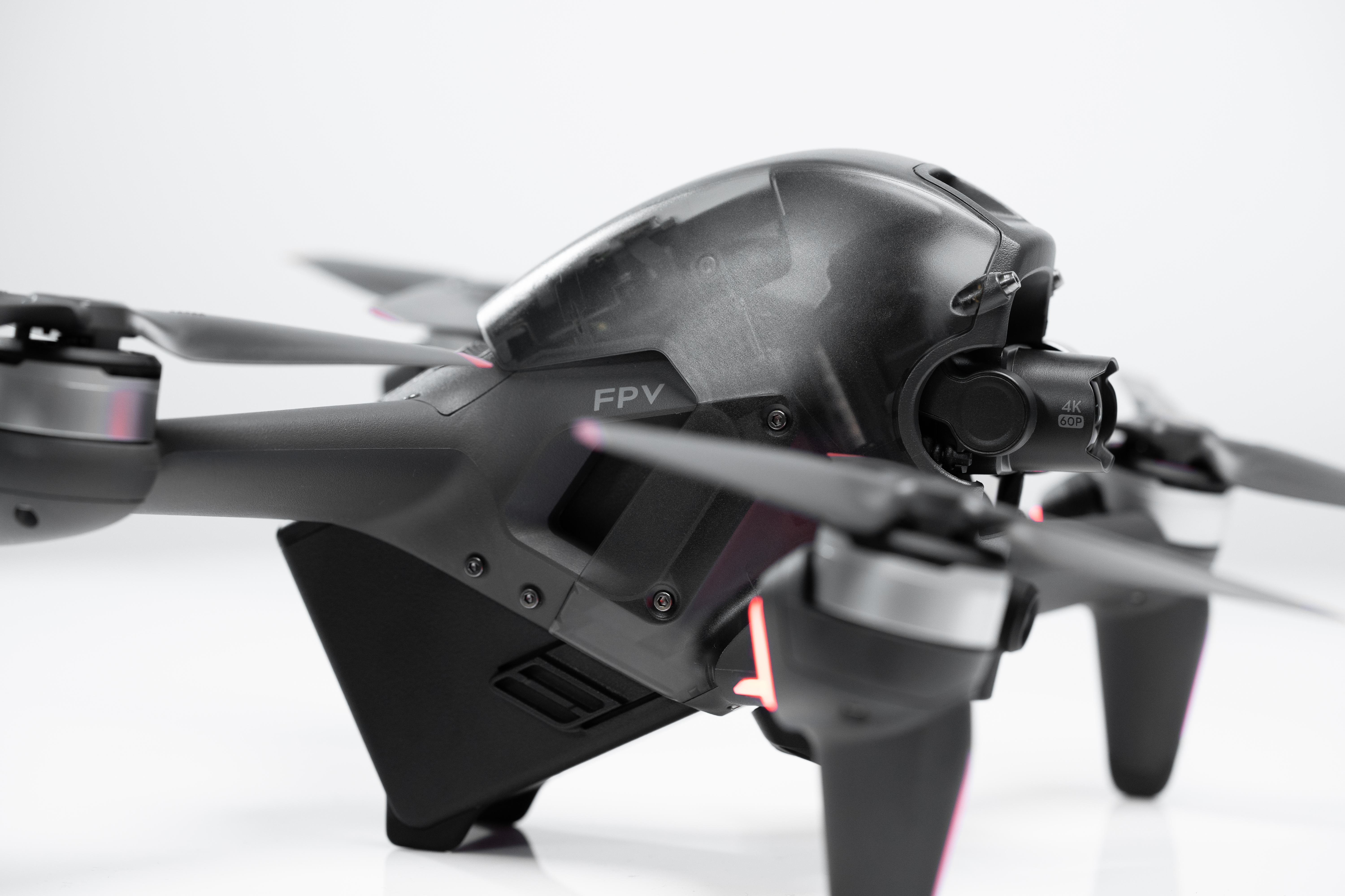 DJI FPV全機彩雲台相機、腳架、外殼與電池均可快速拆換設計,因此在機體受到損毀時能夠快速進行更換,無需更換整機。機體前方也具備進氣設計,在飛行撞風時能產生氣流進而進行機體散熱,後方也同樣具備散熱鰭片,增加機體散熱效果。