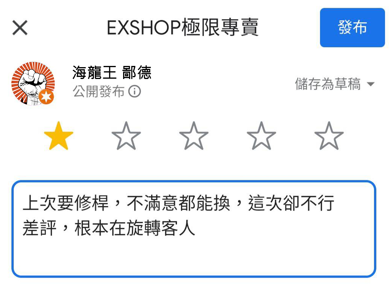 於是你事後越想越不對勁,覺得店家沒誠意處理,自己一定被坑了,先到評論留個一星負評壓壓驚。