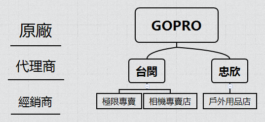(原廠) GoPro → (代理商) 台閔等 → (經銷商) 極限專賣、各大3C店家。