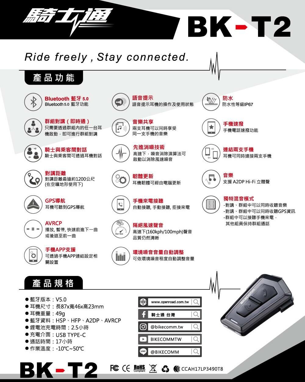 騎士通 BK-T2 安全帽藍牙耳機麥克風