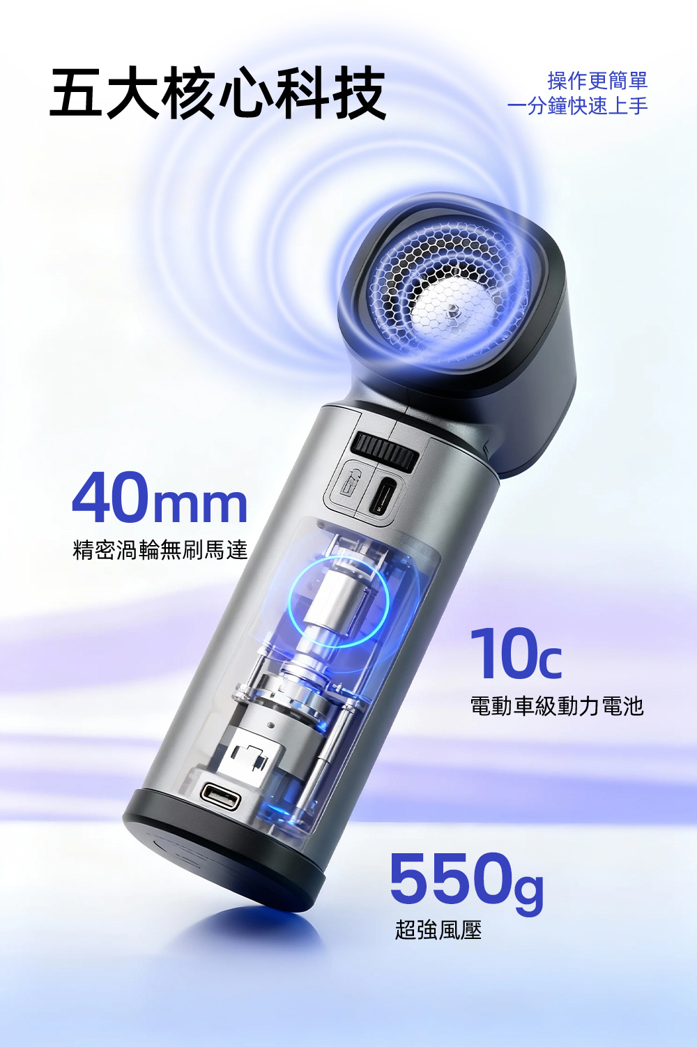 ➤ 最高 550G 暴風級風力,小體積也能展現強勁清潔力