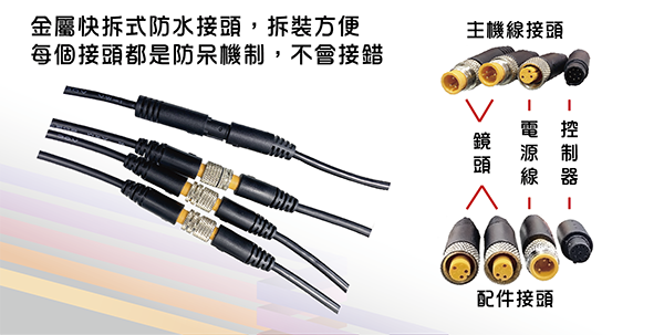 • 線材採用金屬快拆式防水接頭,全面提升便利性安全性
