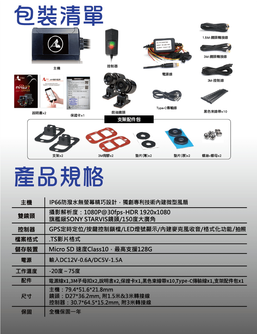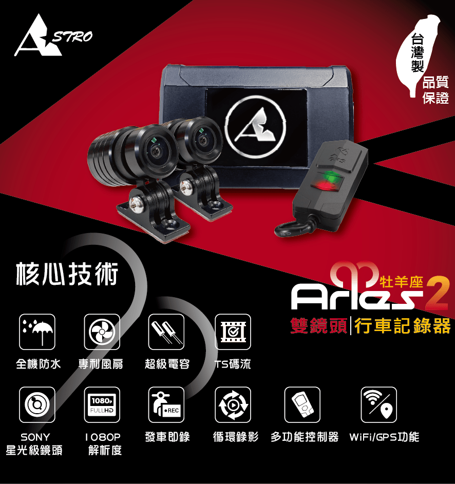 ARIES2 牡羊座前後雙鏡頭機車行車紀錄器,內建微型散熱風扇,主機無螢幕更輕巧!