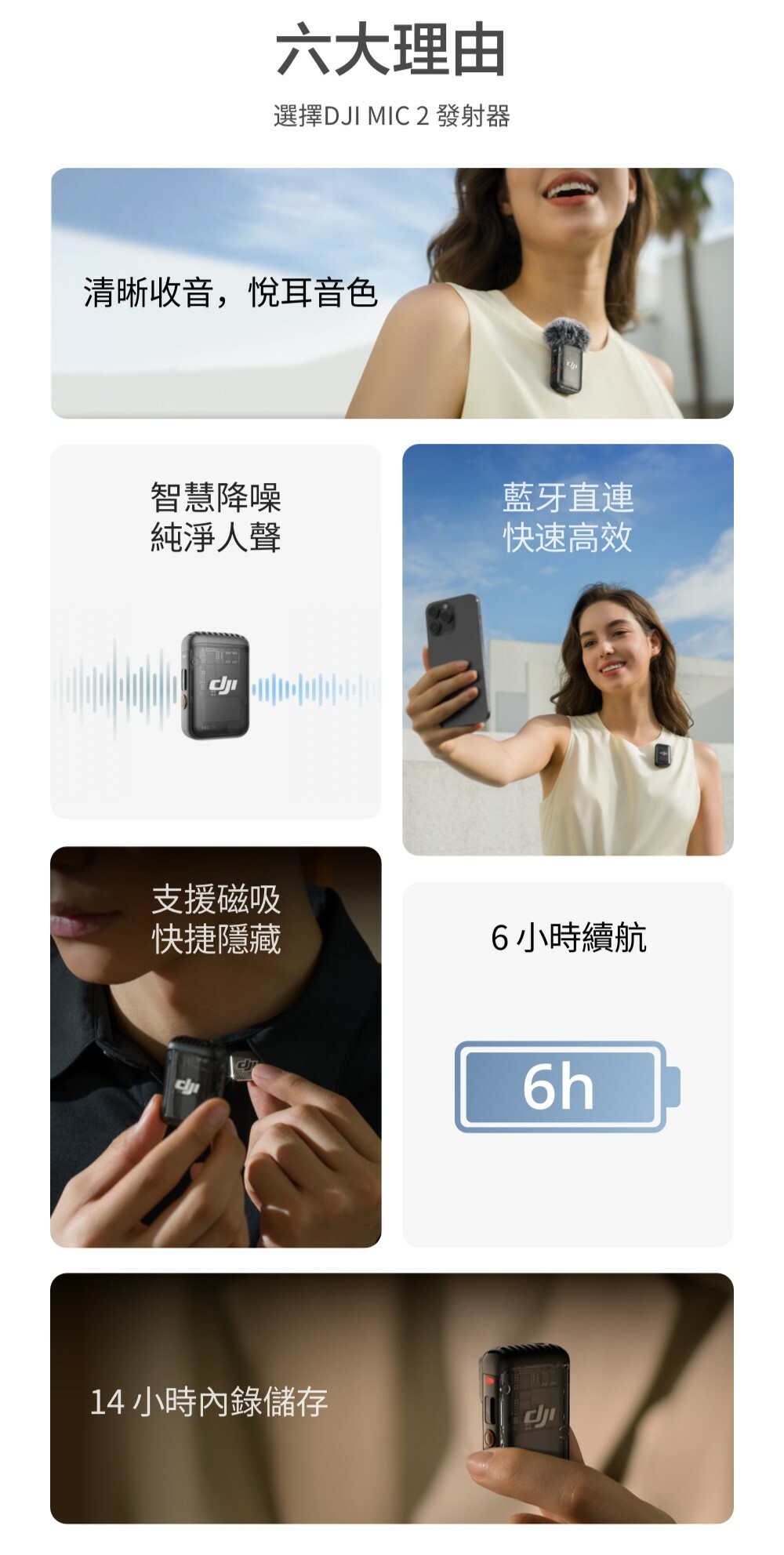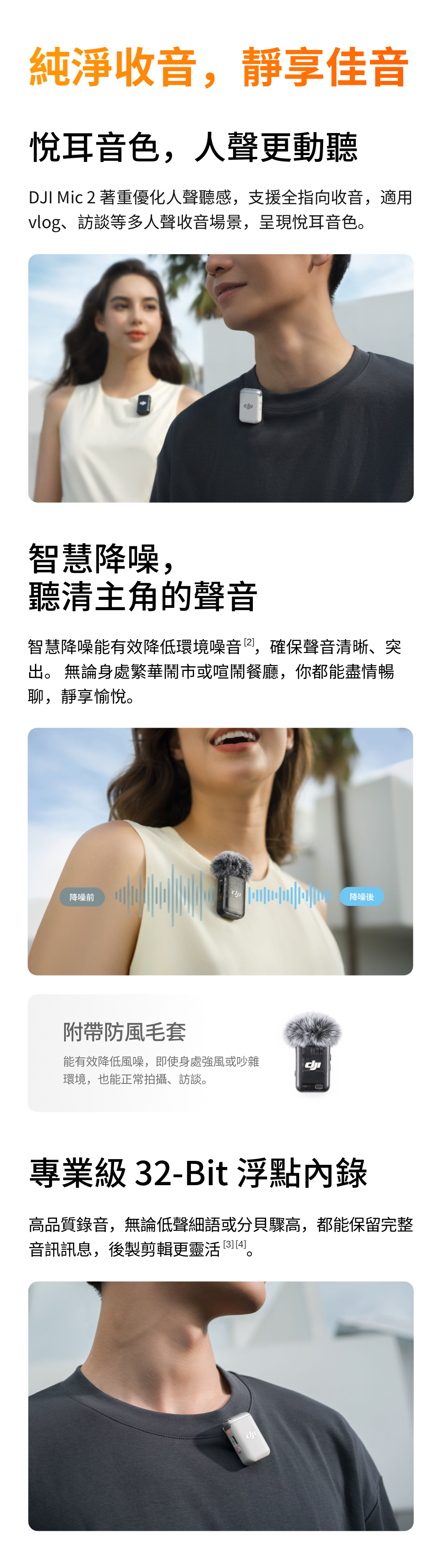 • 智慧降噪,人聲收音準確清晰,適用 Vlog、訪談等多種場合