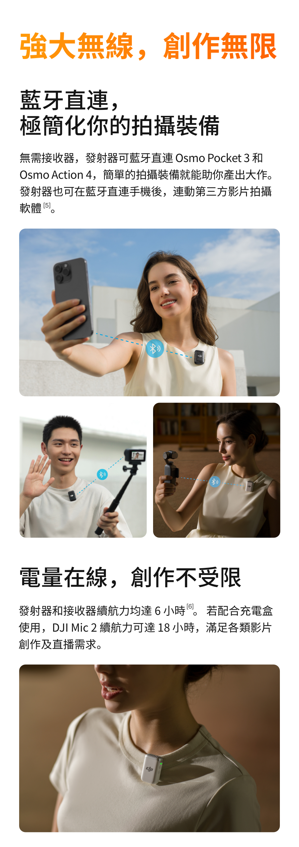 • 無需接受器,發射器可直連 Osmo Pocket 3 和 Osmo Pocket 4