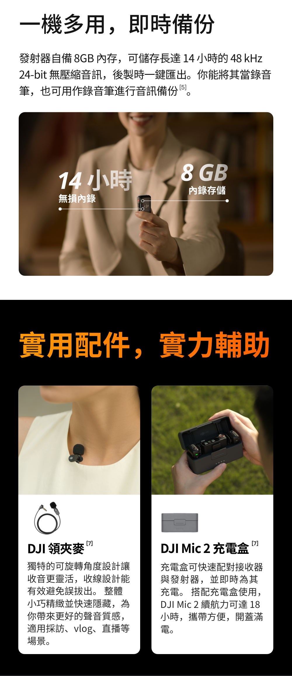 • 發射器內建 8GB 儲存容量,能儲存 14 小時的 48 kHz 24 位元無壓縮音訊