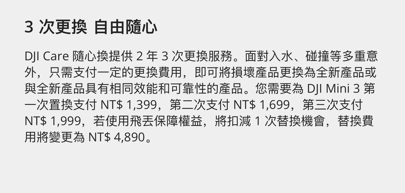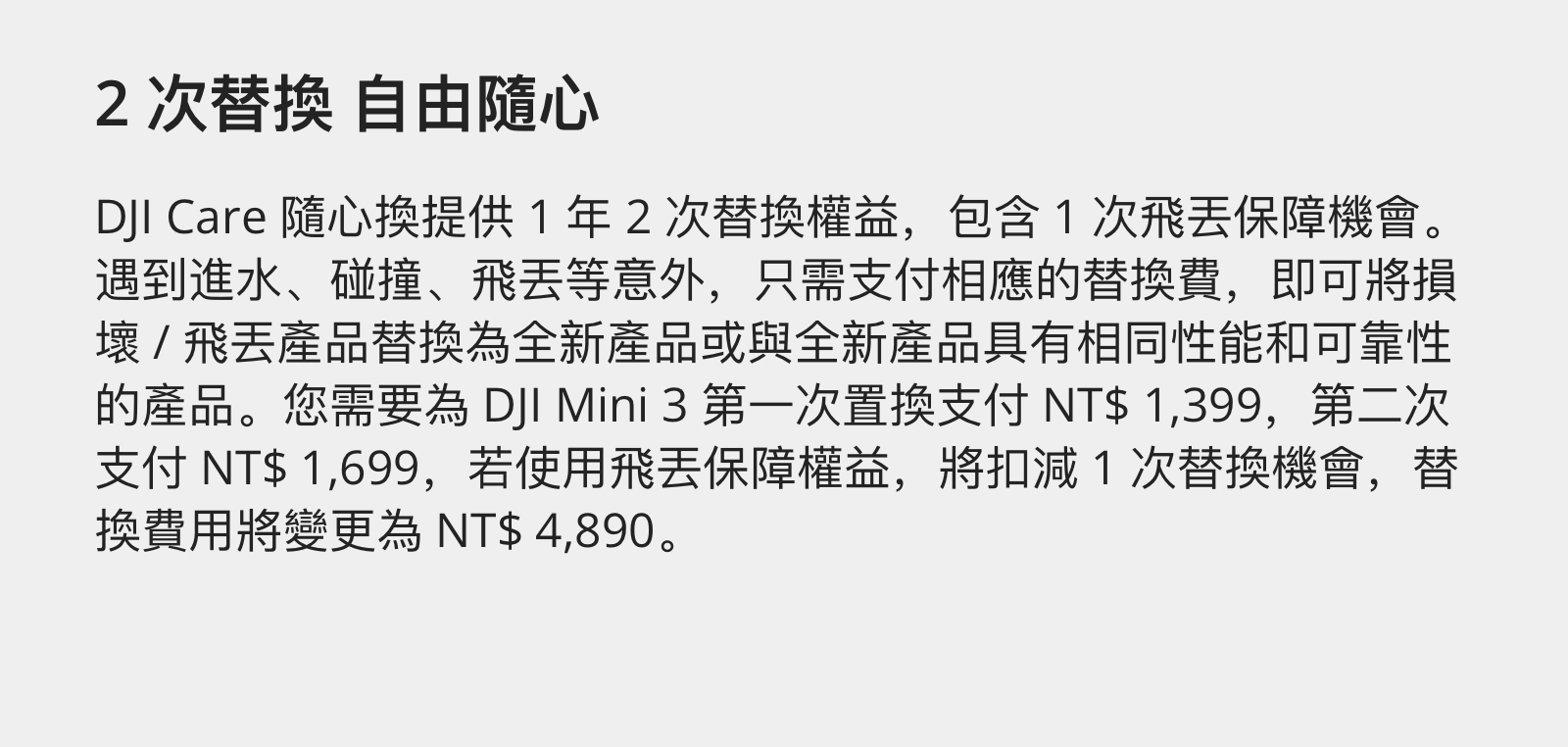 • 為您提供 1 年內 2 次低價置換服務,涵蓋跌落撞壞、意外進水、飛丟失聯、自然磨損等多種意外造成的機器損壞