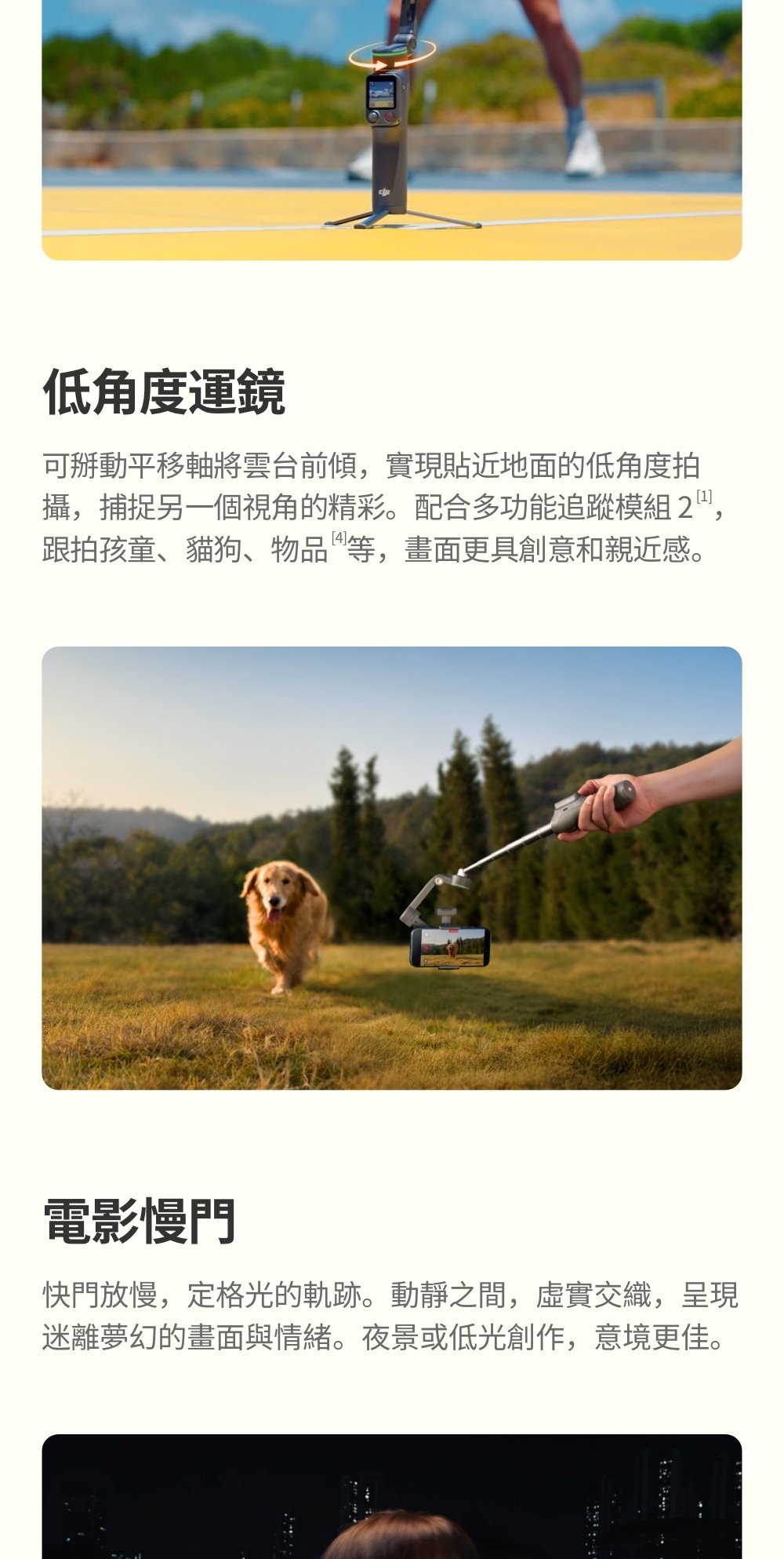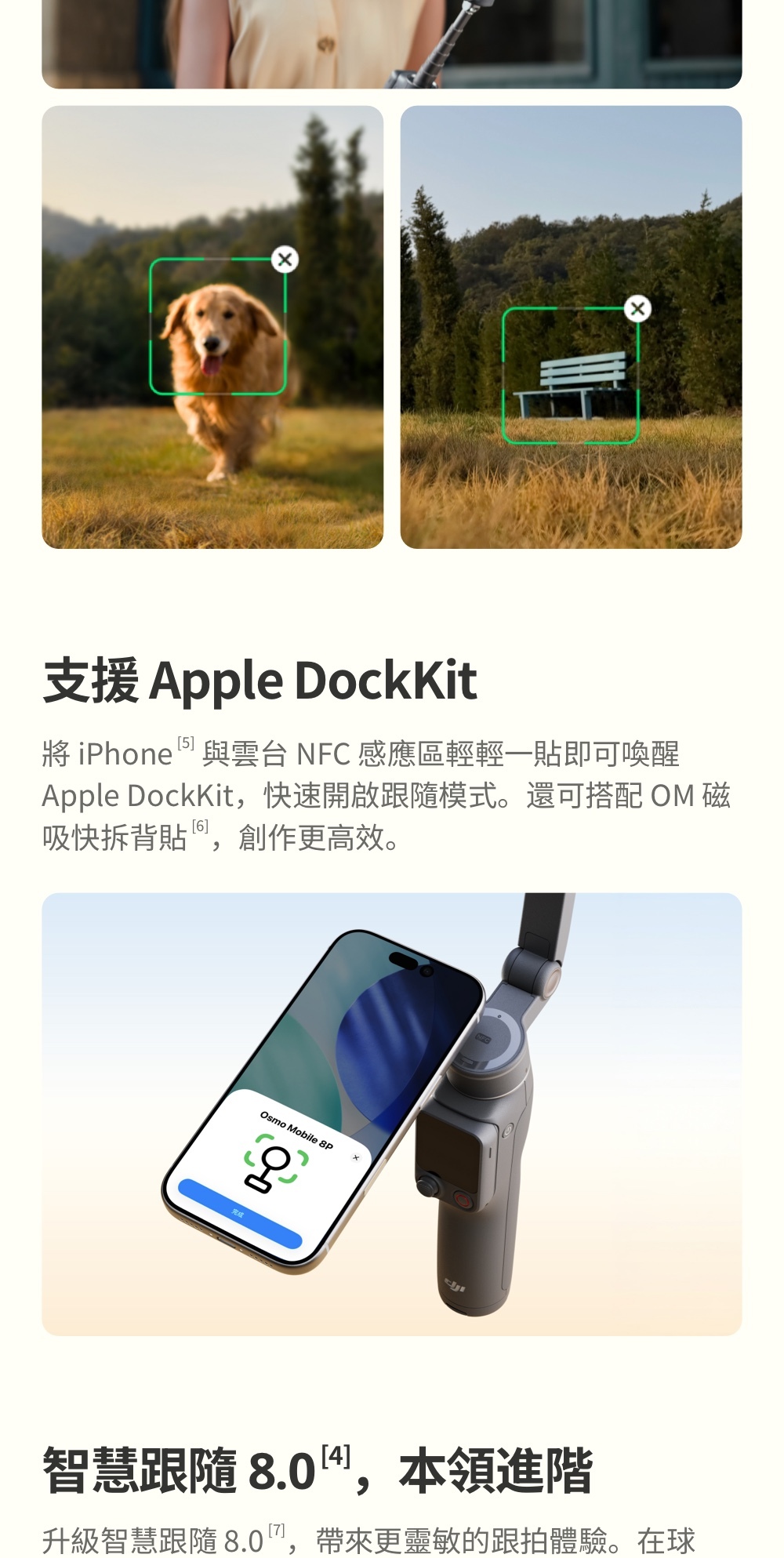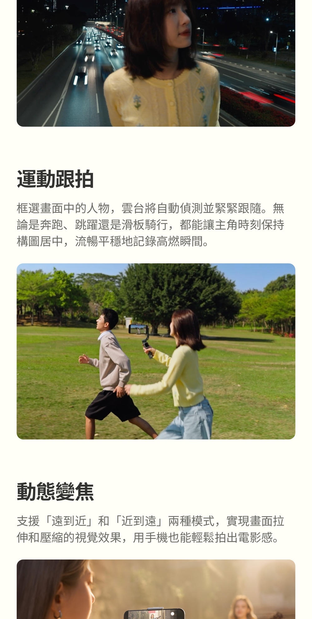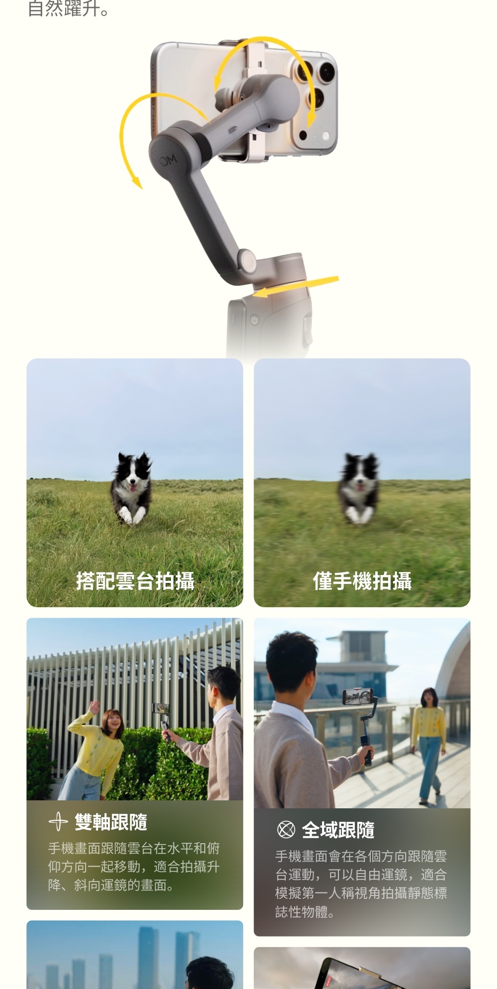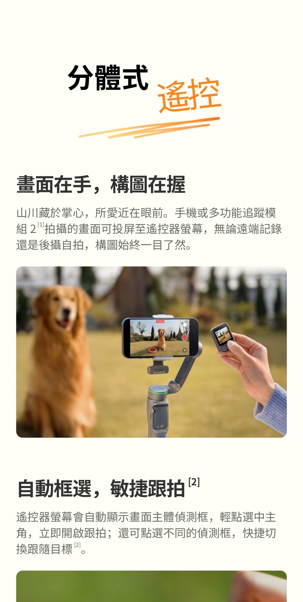 • AI追蹤模組套裝: 雲台主體、磁吸手機夾5、取景遙控器、多功能追蹤模組2;多功能追蹤模組2流暢跟隨人物、貓狗與物品。