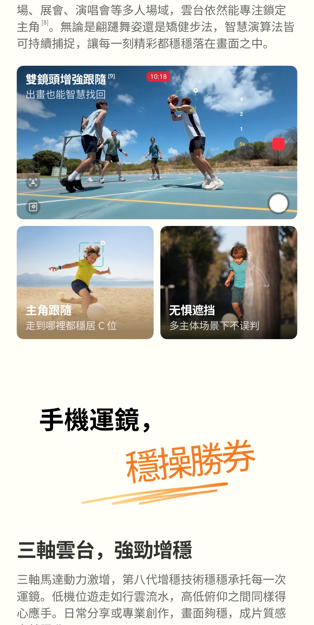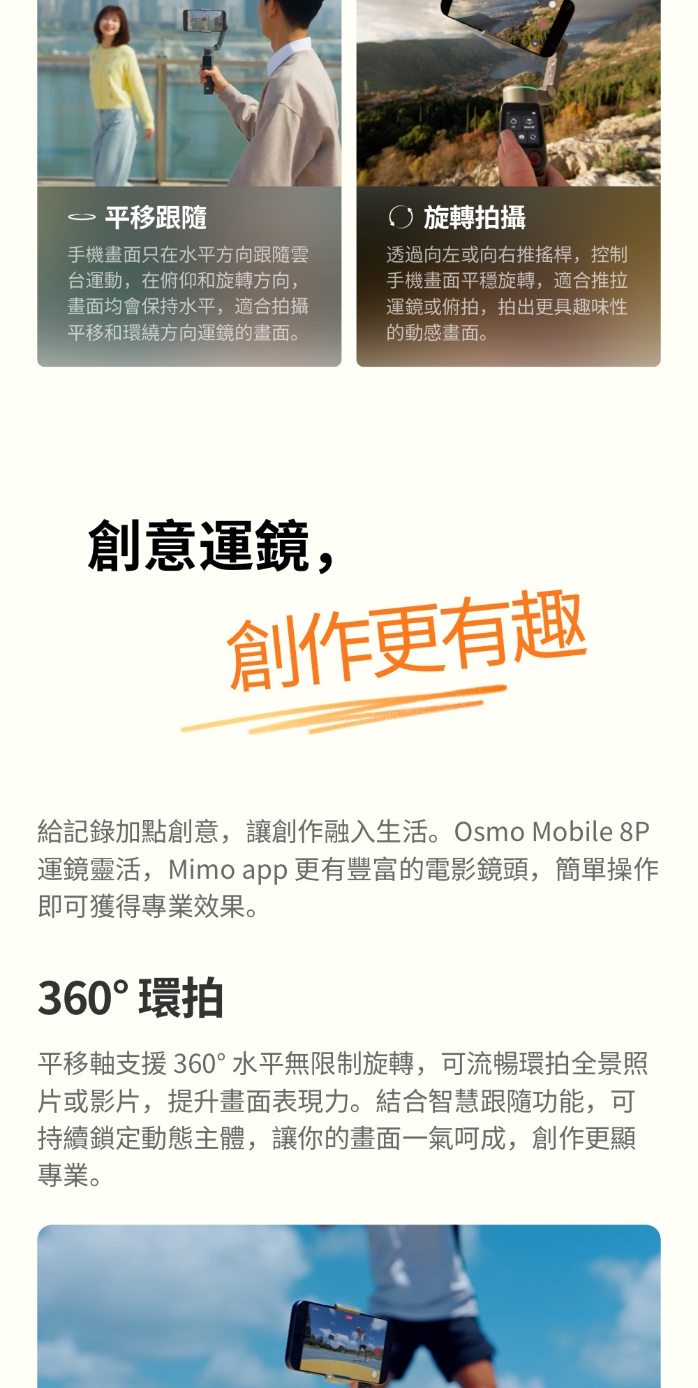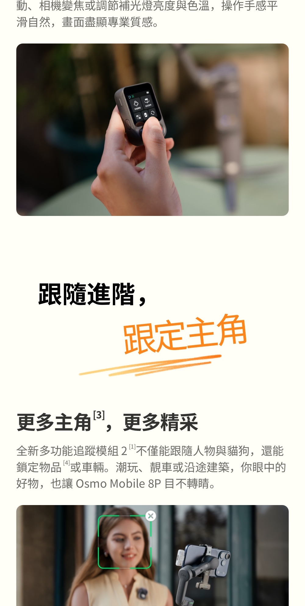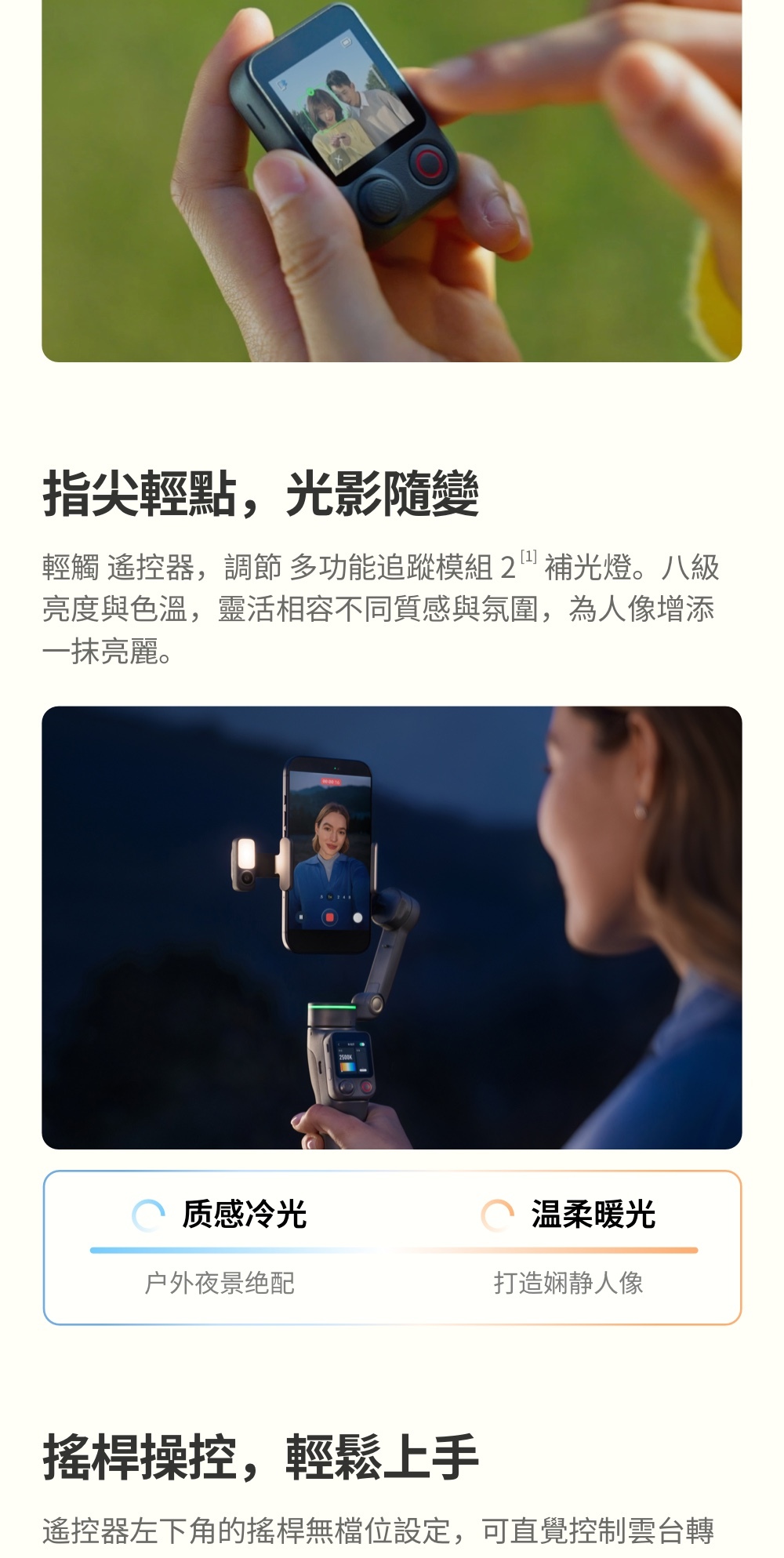 • 標準套裝: 雲台主體、磁吸手機夾5、取景遙控器;分體遙控遠端精準取景,第八代增穩強效化解抖動。