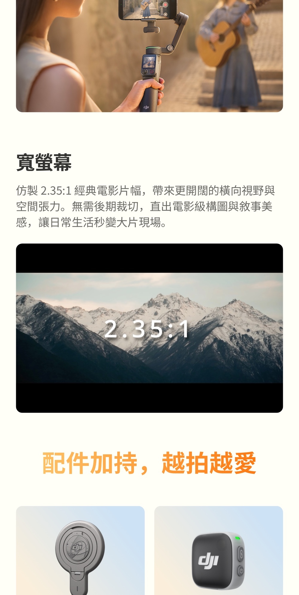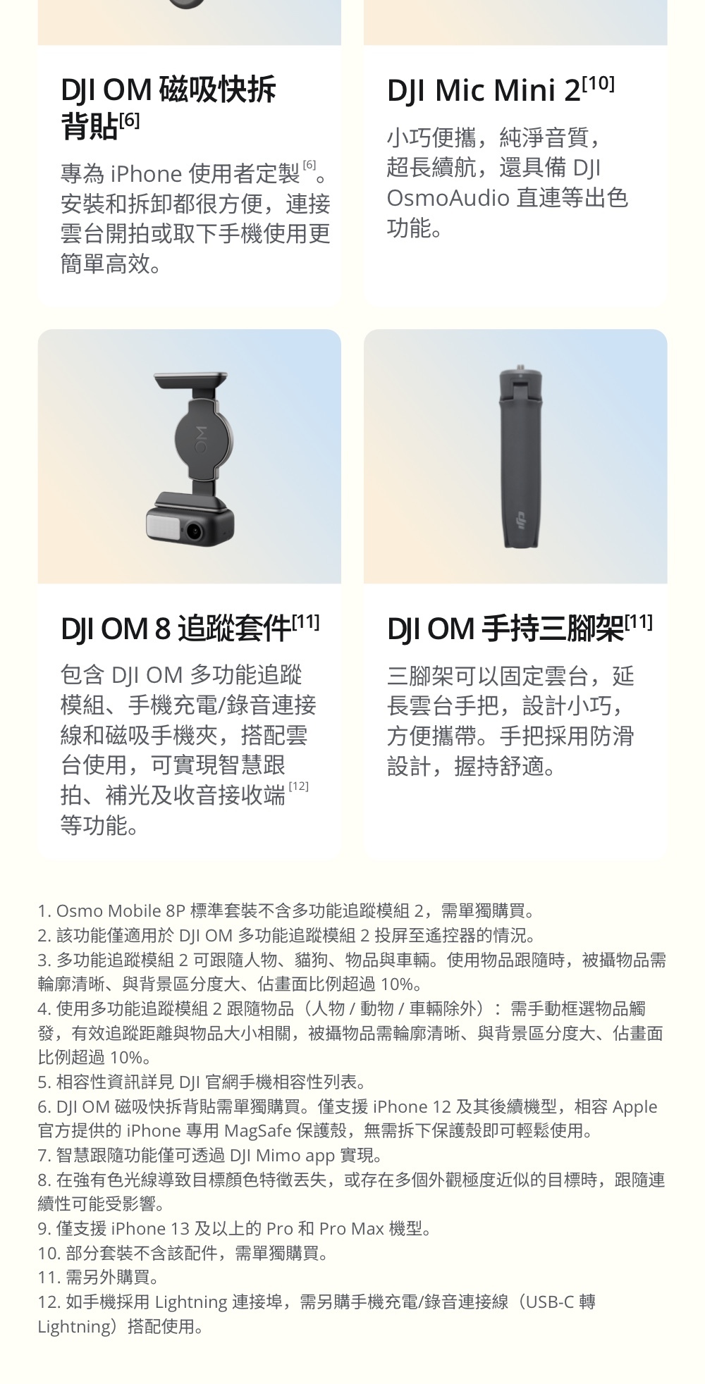 • 全能Vlog套裝: 雲台主體、磁吸手機夾5、取景遙控器、多功能追蹤模組2、Mic Mini 2 發射器、Mic 系列手機版接收器;額外包含發射器與手機版接收器,進階收音。