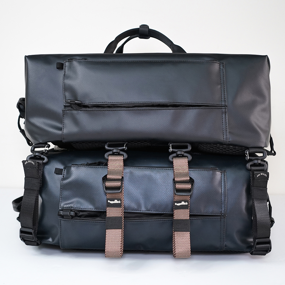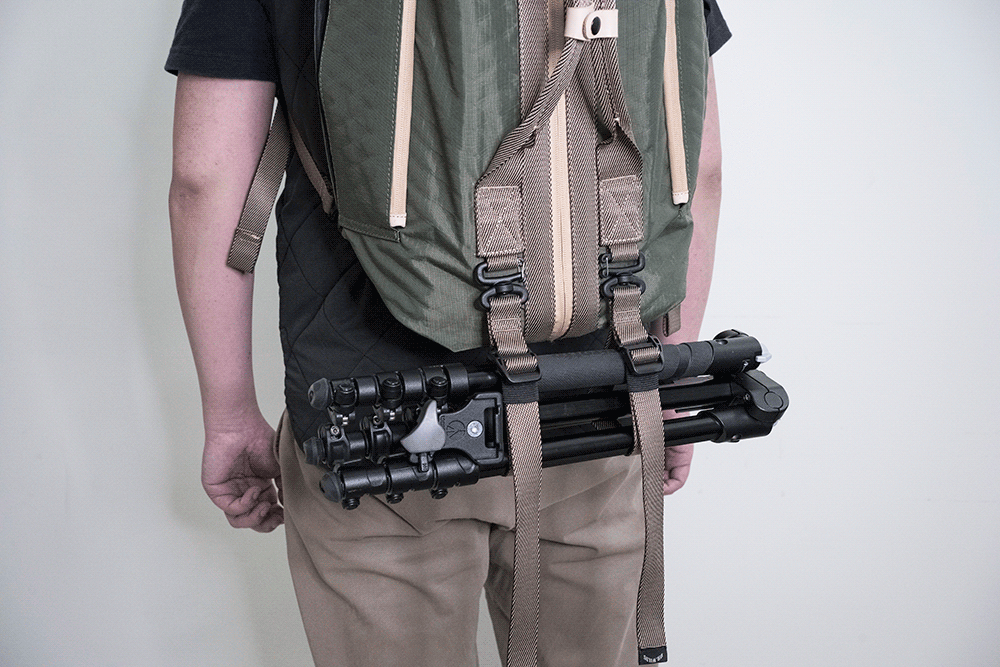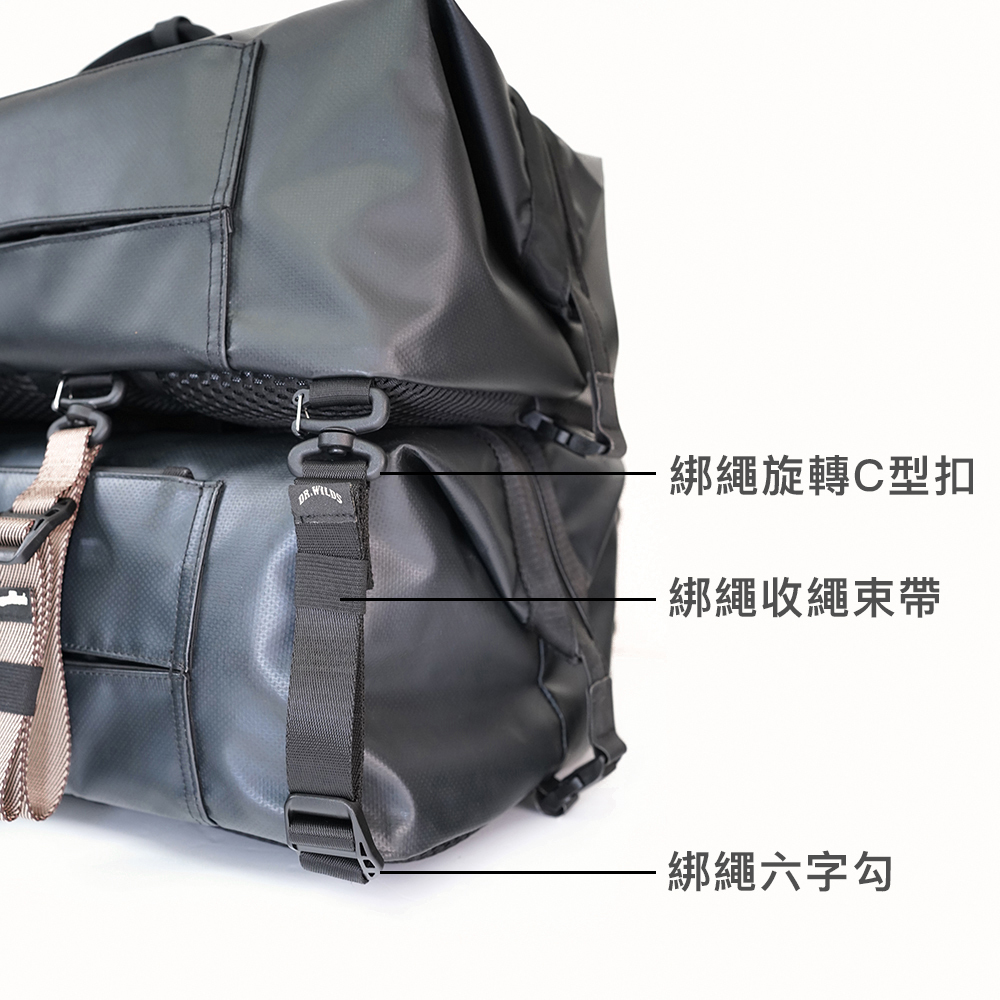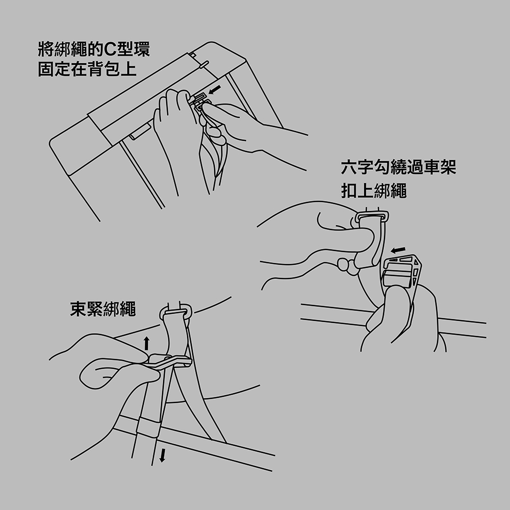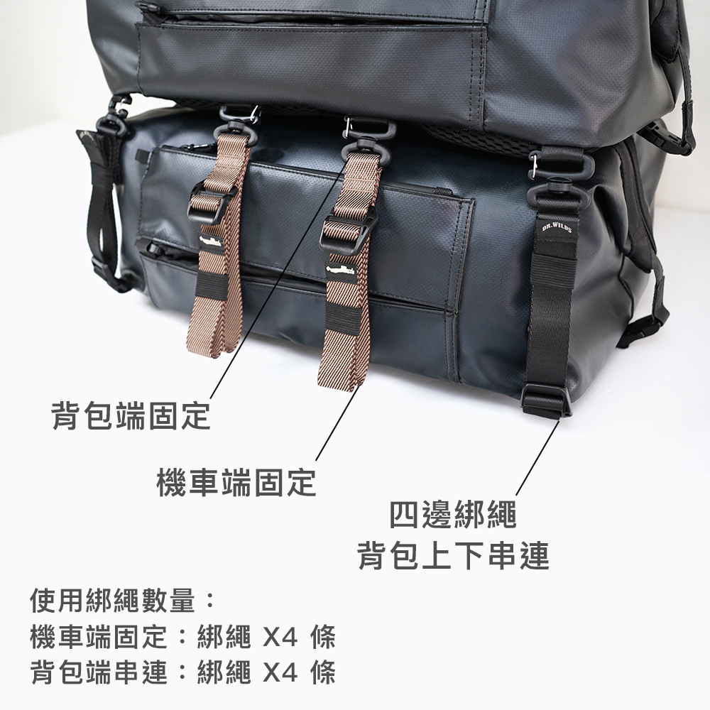 • 背包上設計有擴充織帶環,可掛綁繩,將背包固定於車上