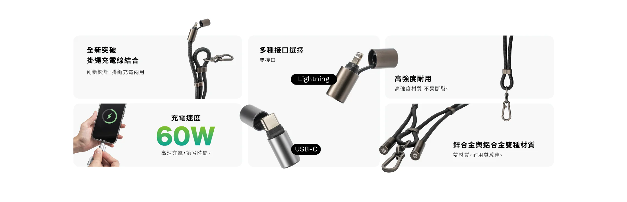 • 全新突破 掛繩充電線結合:創新設計,掛繩充電兩用