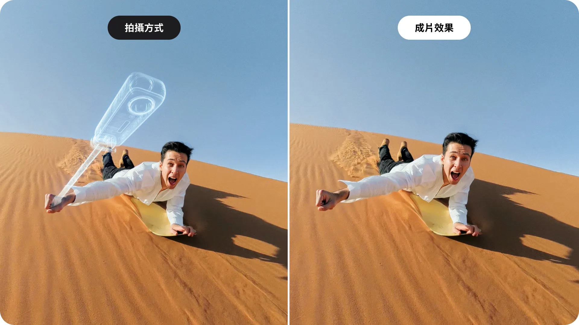 搭配影石全景相機,輕鬆拍出第三人稱視角和空拍機般的跟拍效果。
