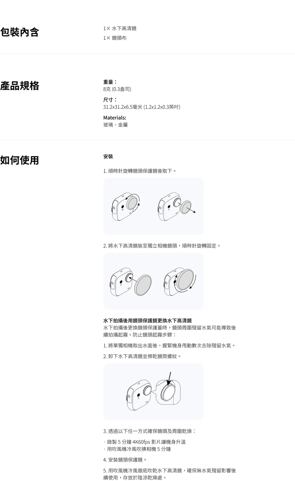 • 水下拍攝後,在非水下環境拍攝前請轉用 GO Ultra 原廠鏡頭保護鏡。