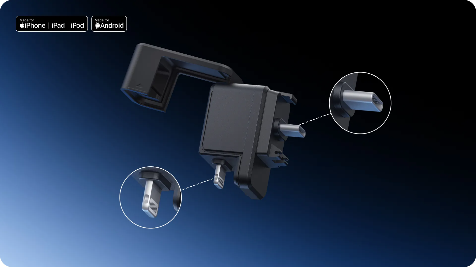 • 雙插頭設計同時相容於 iOS 與 Android 裝置。