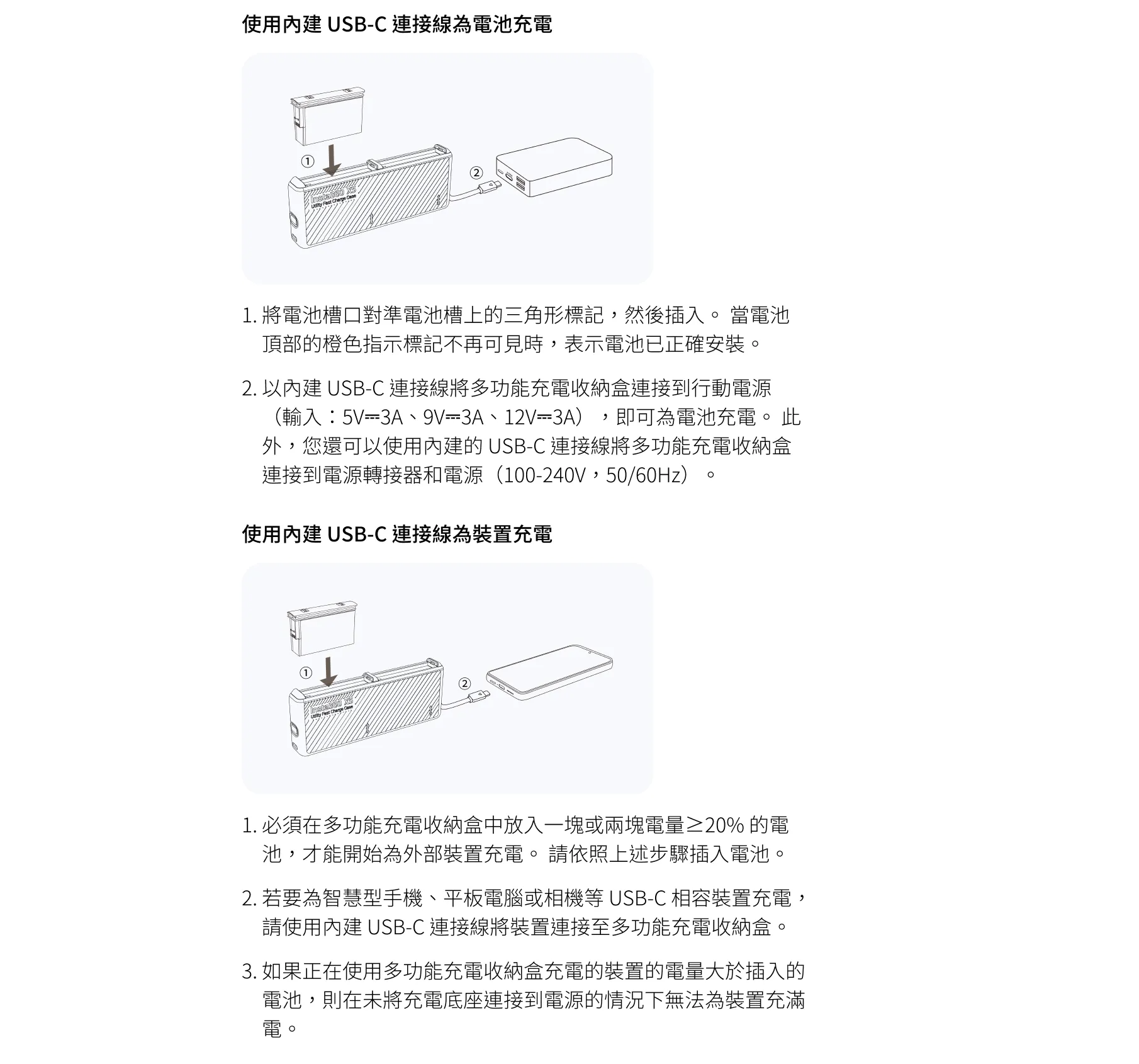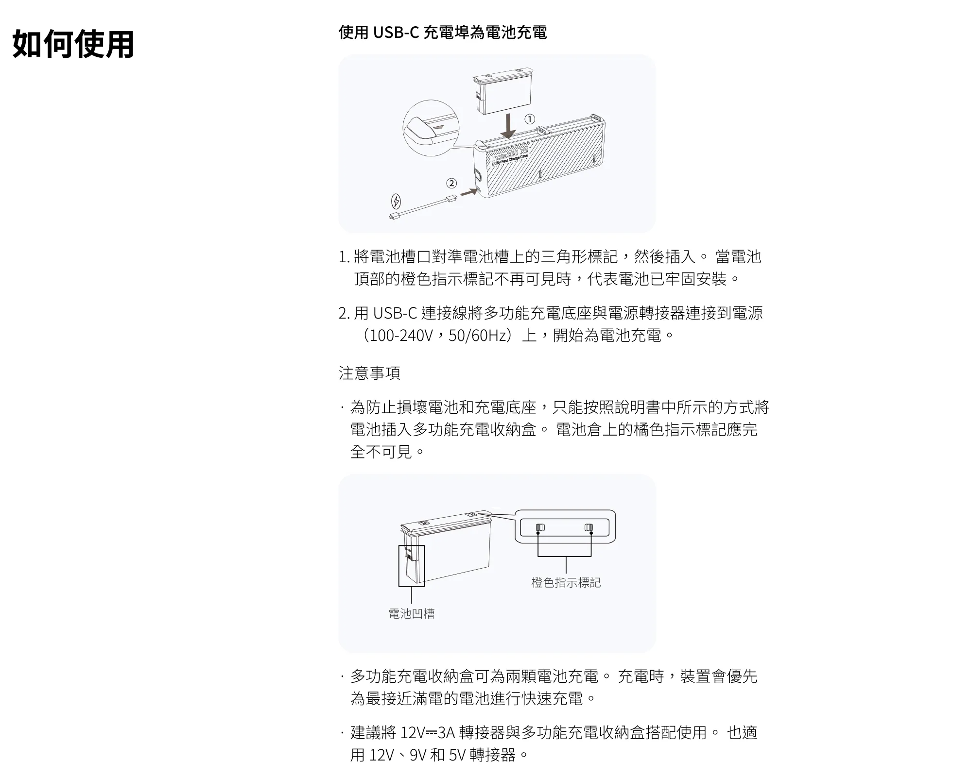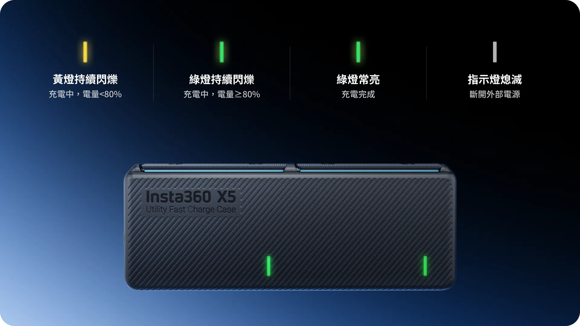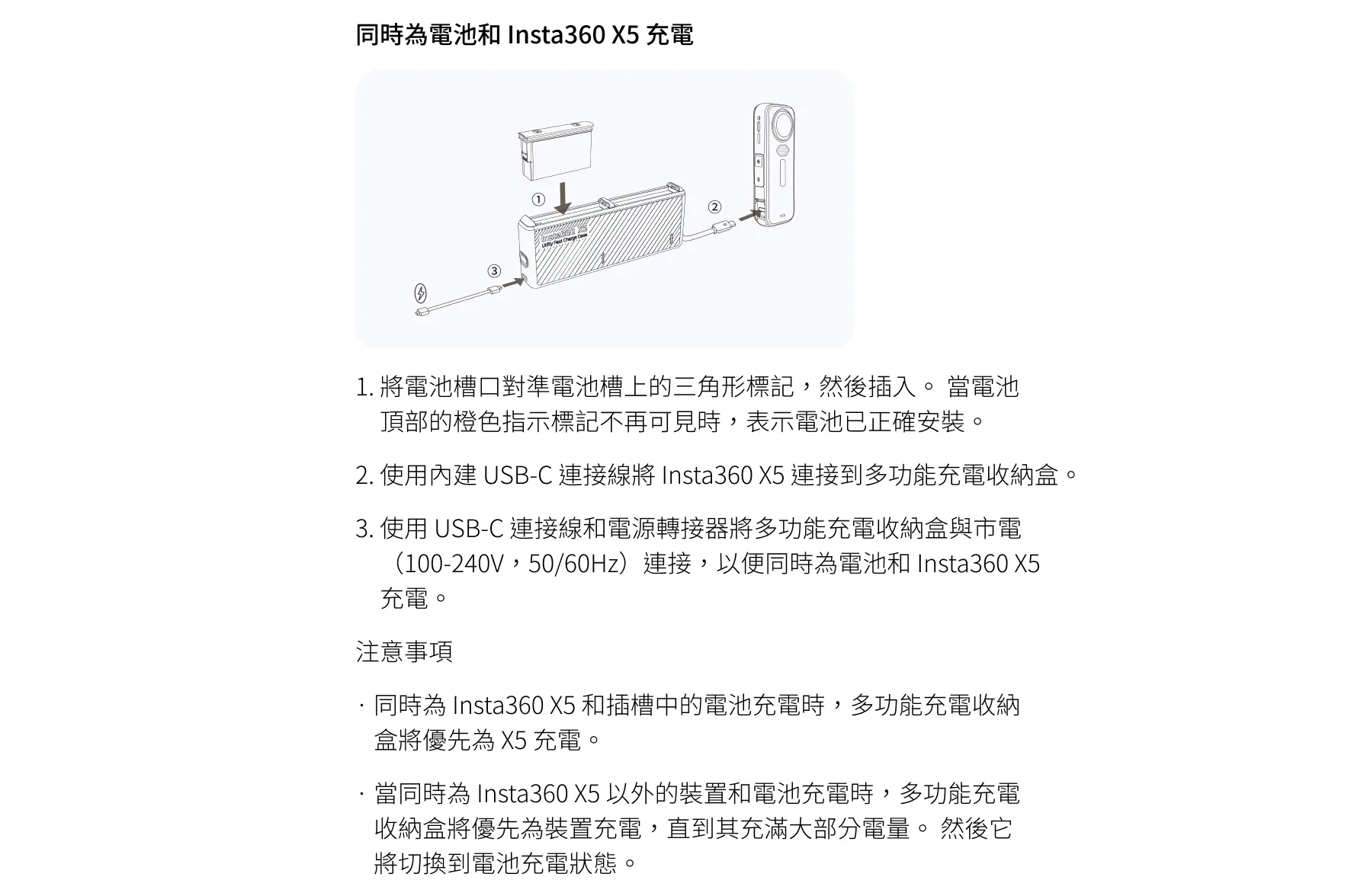 1. 多功能充電收納盒僅適用於 Insta360 X5 電池。 其他型號的電池不能使用本裝置充電。