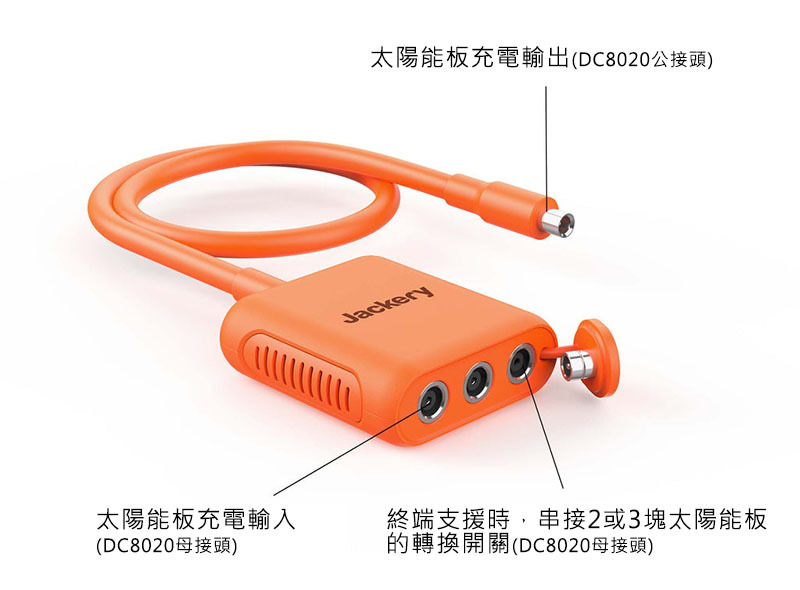 • 用於串接Jackery太陽能發電板,為Jackery儲能行動電源充電