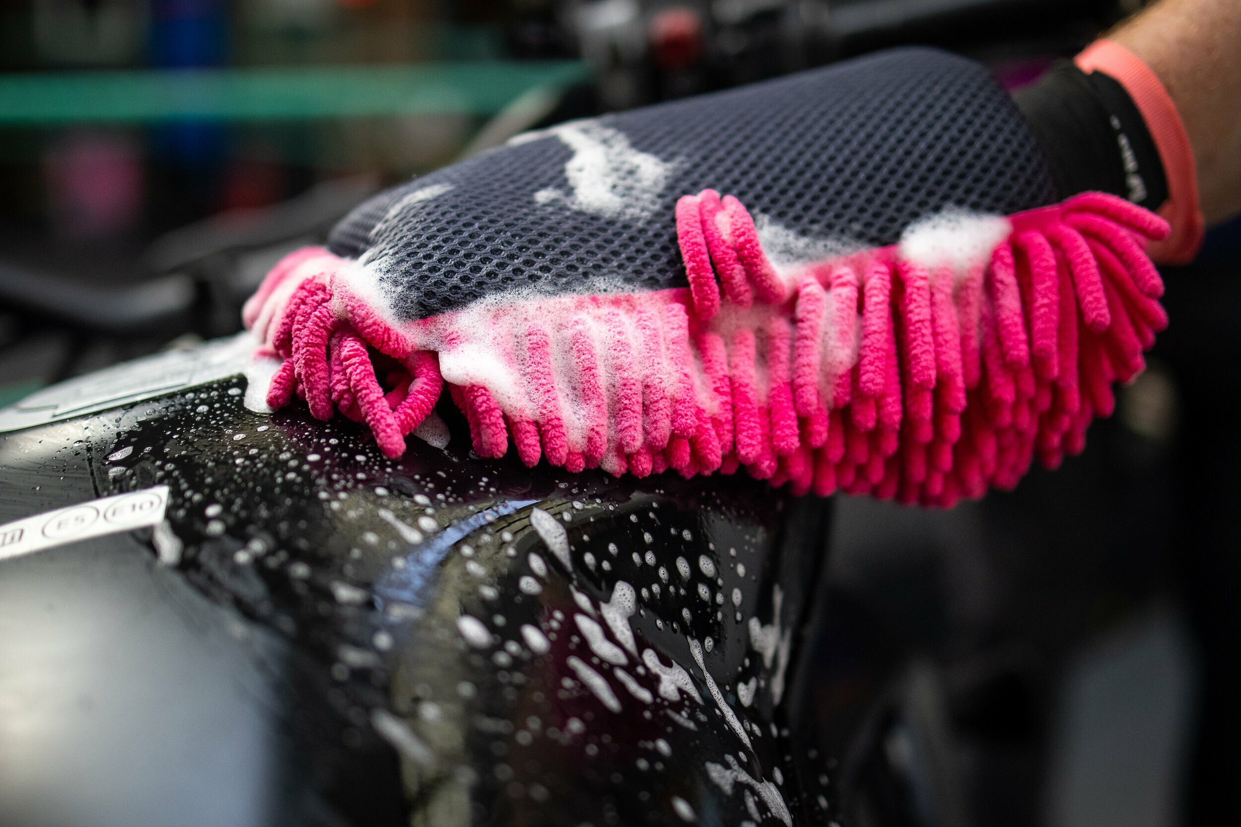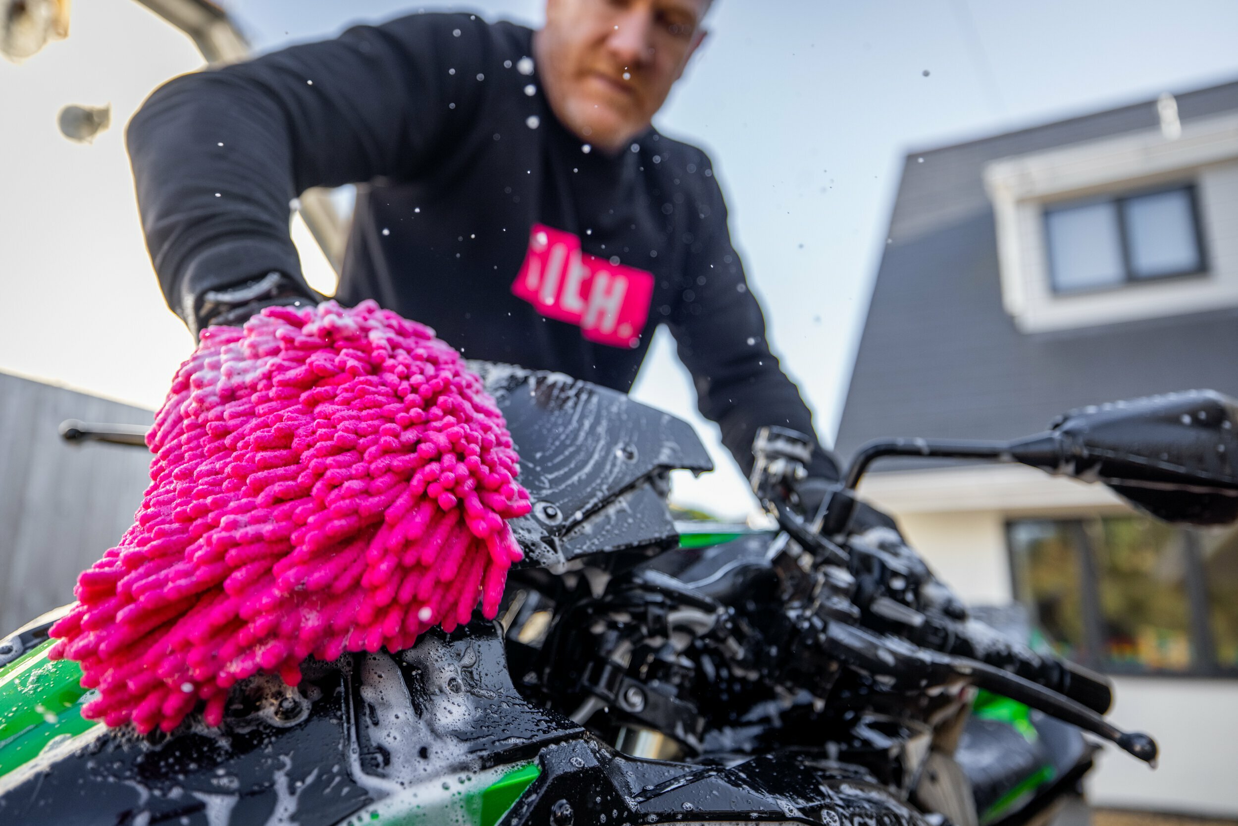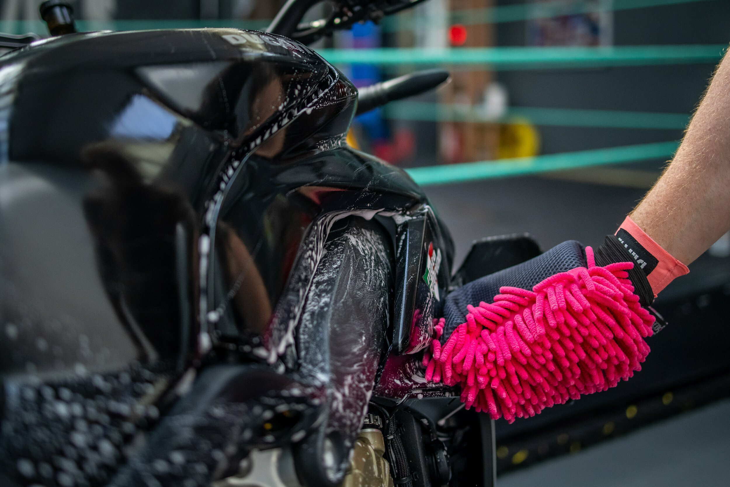1. 將奈米科技機車清潔劑或泡泡洗車精噴在要清潔的區域,或直接噴在手套上。