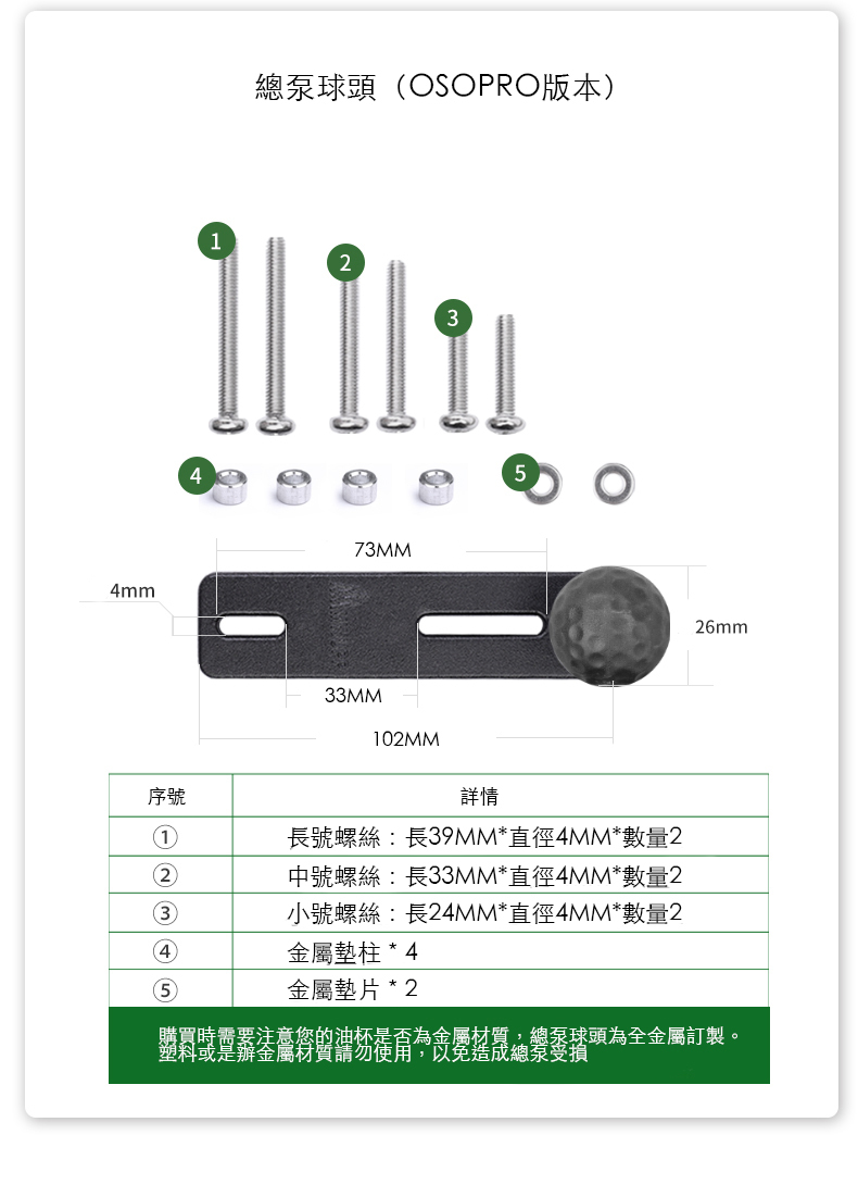 • 針對不同油泵,附贈 3 種長度的螺絲