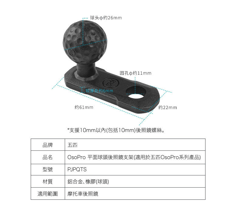 • 五匹 OsoPro 平面球頭 後照鏡支架 x1