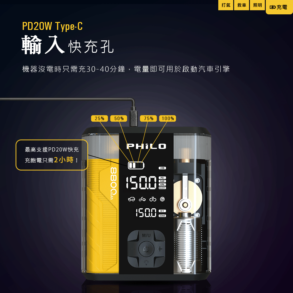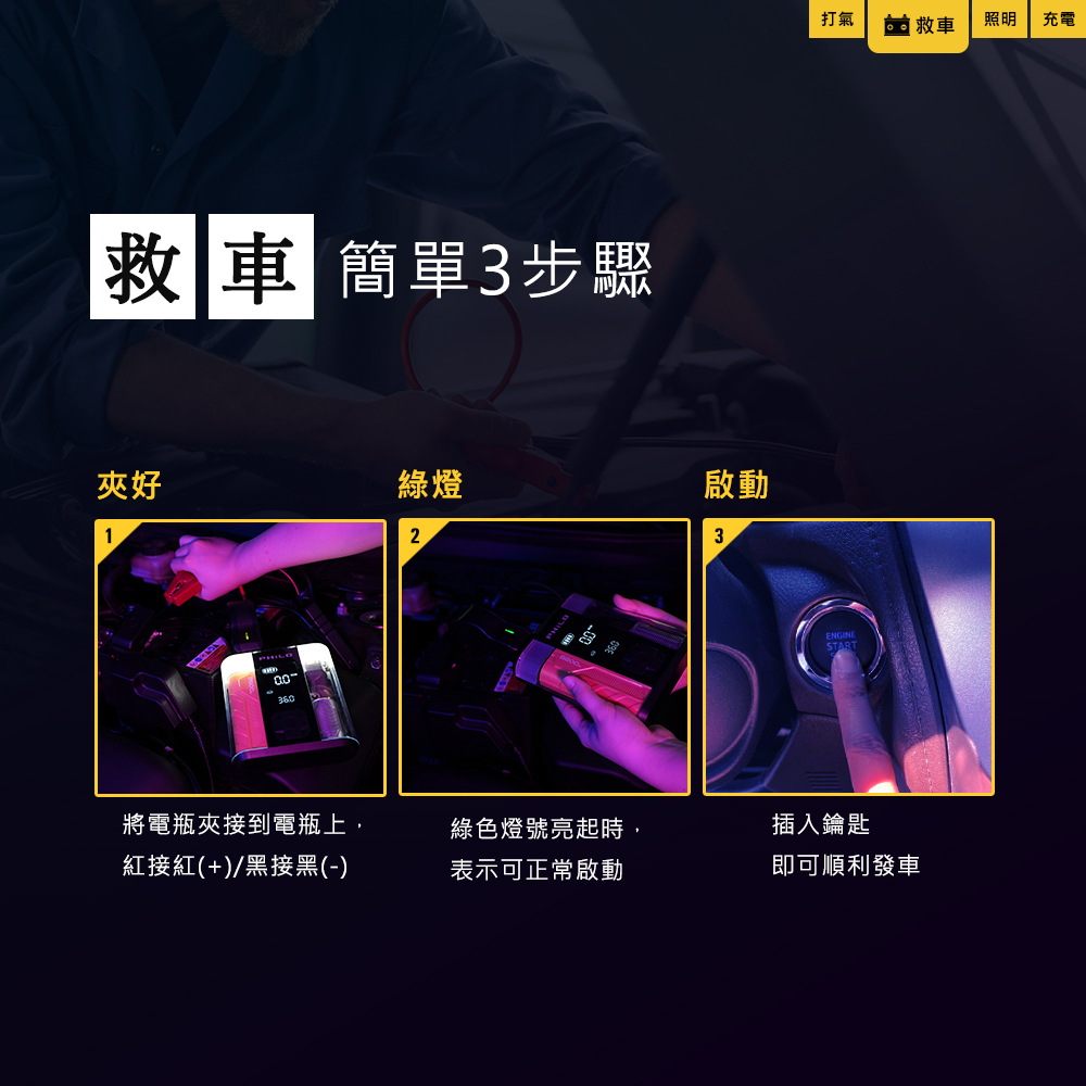• 具有 4 合 1 多功能,包括救車、打氣、照明、充電