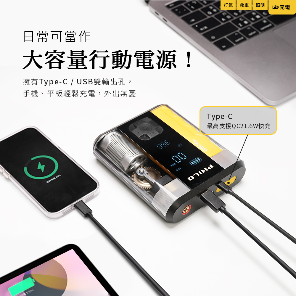 • 擁有Type-C / USB雙輸出孔,日常可當行動電源幫手機、平板充電,Type-C孔最高支援QC21.6W快充