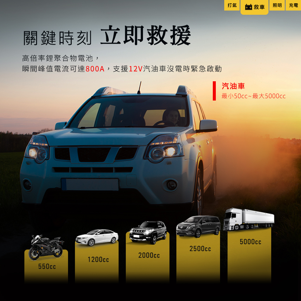 • 支援 50~5000cc 的汽油車,無論是重機、轎車、SUV還是大貨車都能進行救援