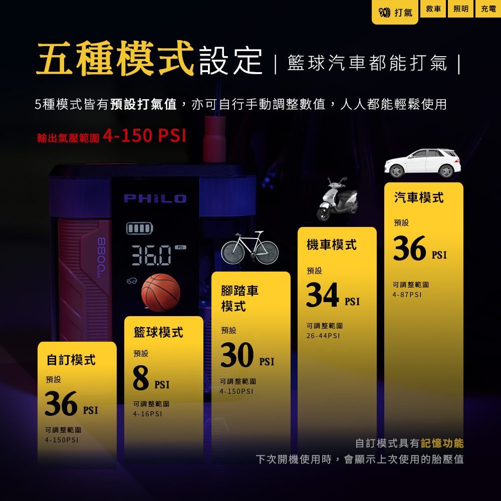 • 五種預設模式,汽車/機車/腳踏車/籃球,最高可設置150PSI