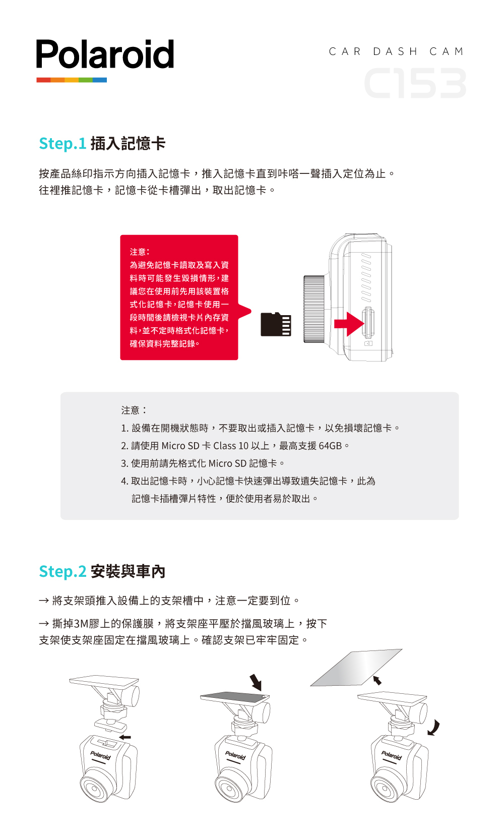 • 記憶卡:Class10 以上Micro SD 64GB(不支援SanDisk記憶卡)
