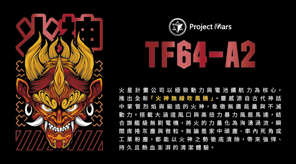 火星計畫是高品質馬達與高續航電池的專家,長期致力於提升人們美好的生活體驗。這次,我們投入在「火神」計畫中 — 期能打造一台能滿足露營、居家、3C清潔、洗車、吹頭髮的五合一無線暴力風機神器。(力道高達1公斤)
