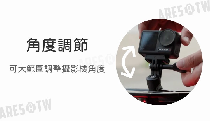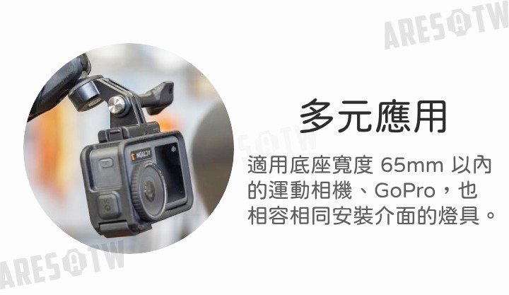 • 廣泛兼容性,適用於底座寬度 65mm 以內的運動相機、GoPro 及其他相容相同安裝介面的燈具