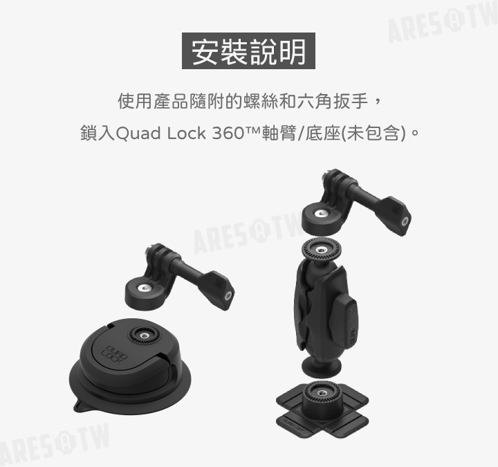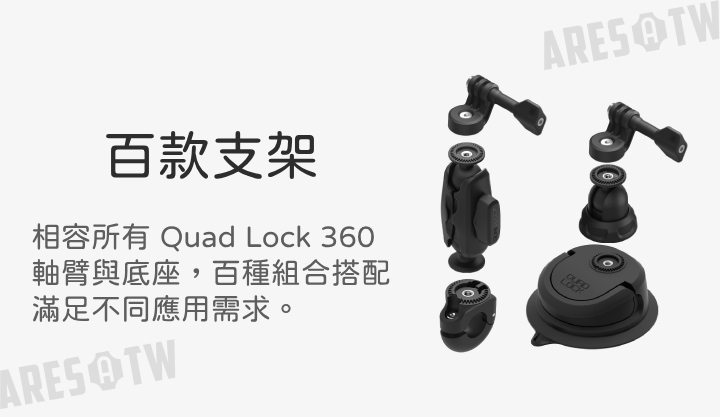 • 兼容 Quad Lock 系統,可與 Quad Lock 360 任一軸臂或底座相容(需另外購買)