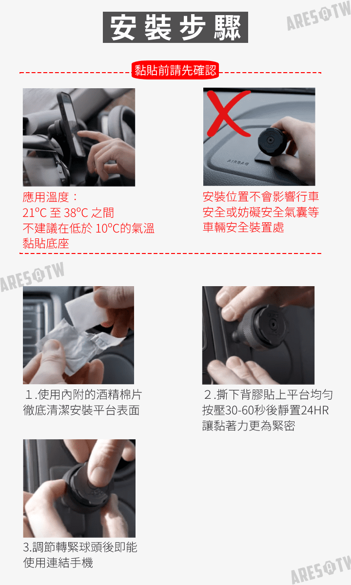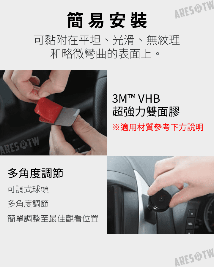• 由於雙面膠接觸到油脂即會失去黏性,如有作汽車美容,汽車內飾/儀錶板/中控台一般會殘留油脂,建議使用環保去漬油擦拭,黏貼前請務必確認安裝區域已徹底清潔