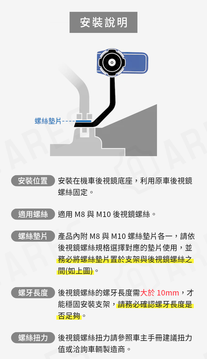 • 如後視鏡延伸支架安裝空間不足,可加購「延伸轉接螺絲」墊高避過