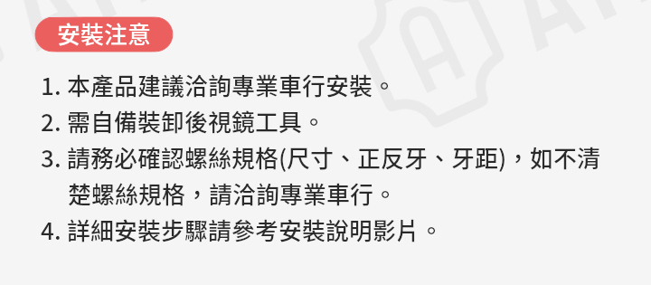 • 請務必確認後視鏡螺絲規格,如不清楚螺絲規格,請洽詢專業車行