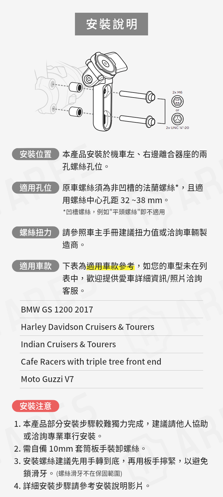 • 本產品部份安裝步驟較難獨力完成,建議請他人協助或洽詢專業車行安裝