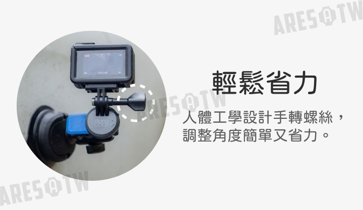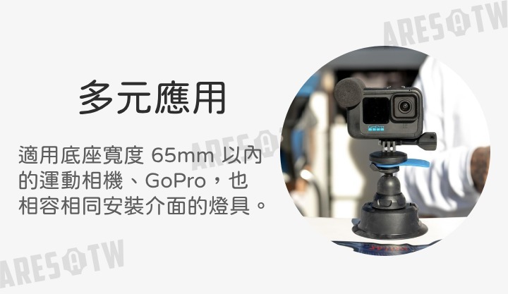 • 通用性高,底座寬度 65mm 以內的運動相機(如GoPro)和燈具