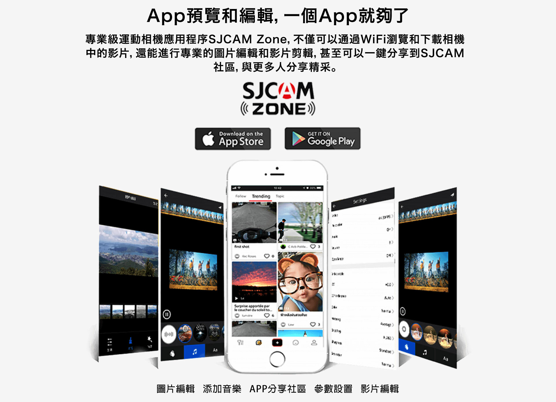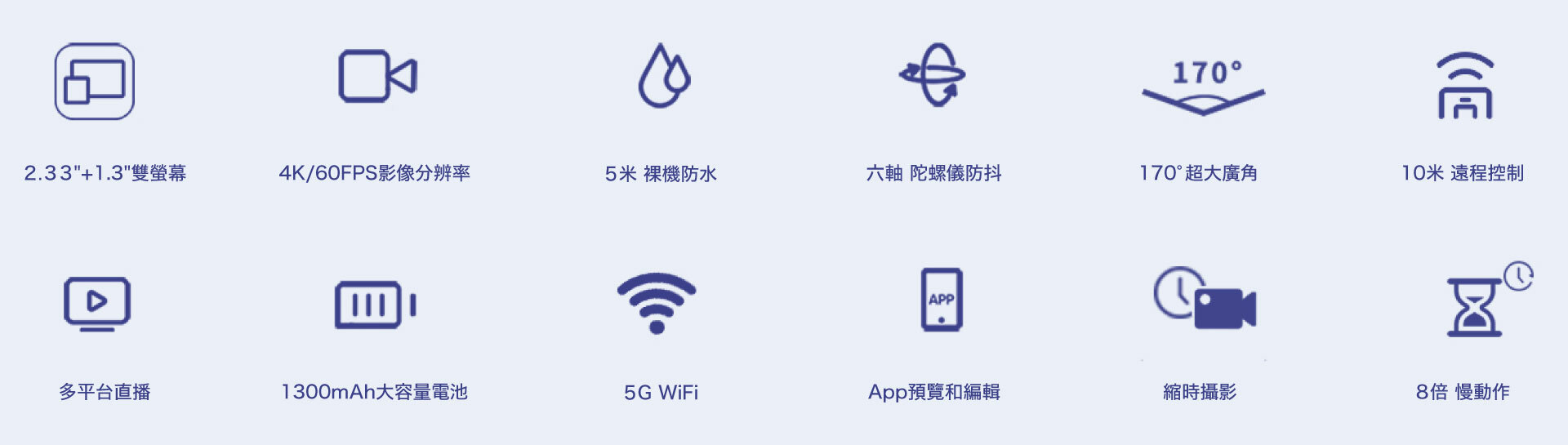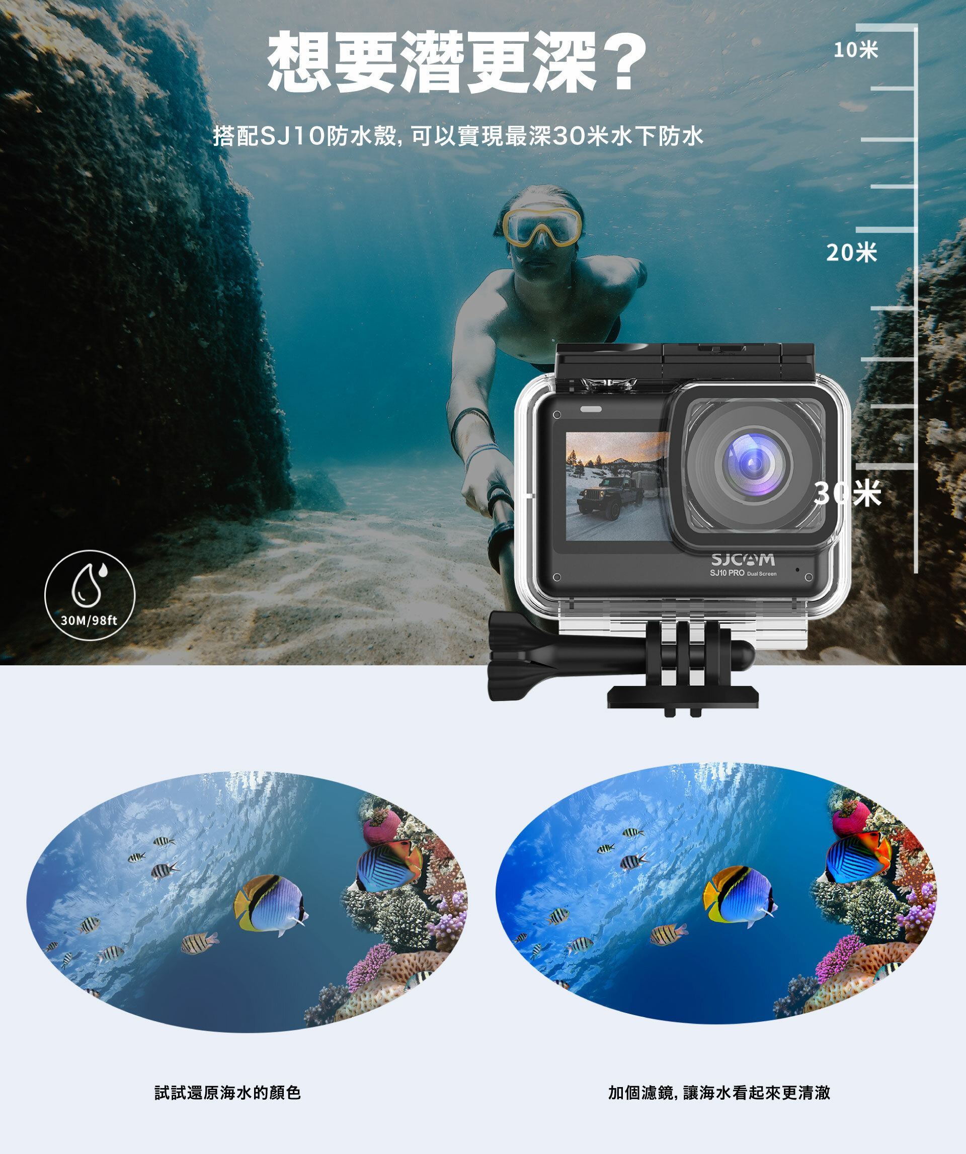 • 裸機5米防水,搭配SJ10防水殼,可達最深30米防水