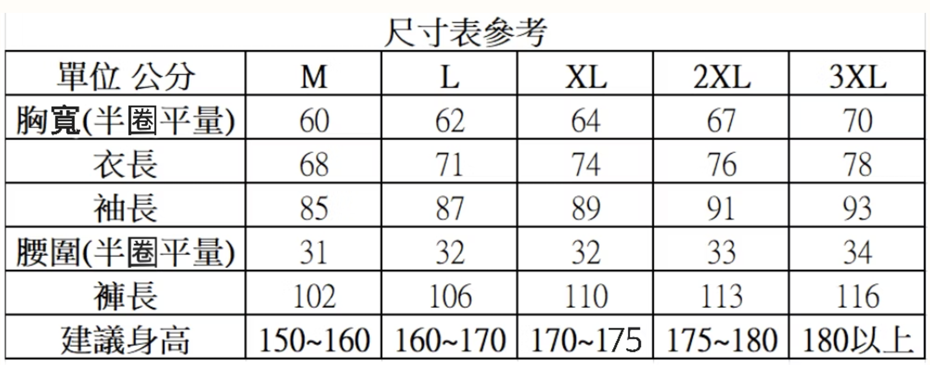 • 尺寸:S / M / L / XL / 2XL / 3XL