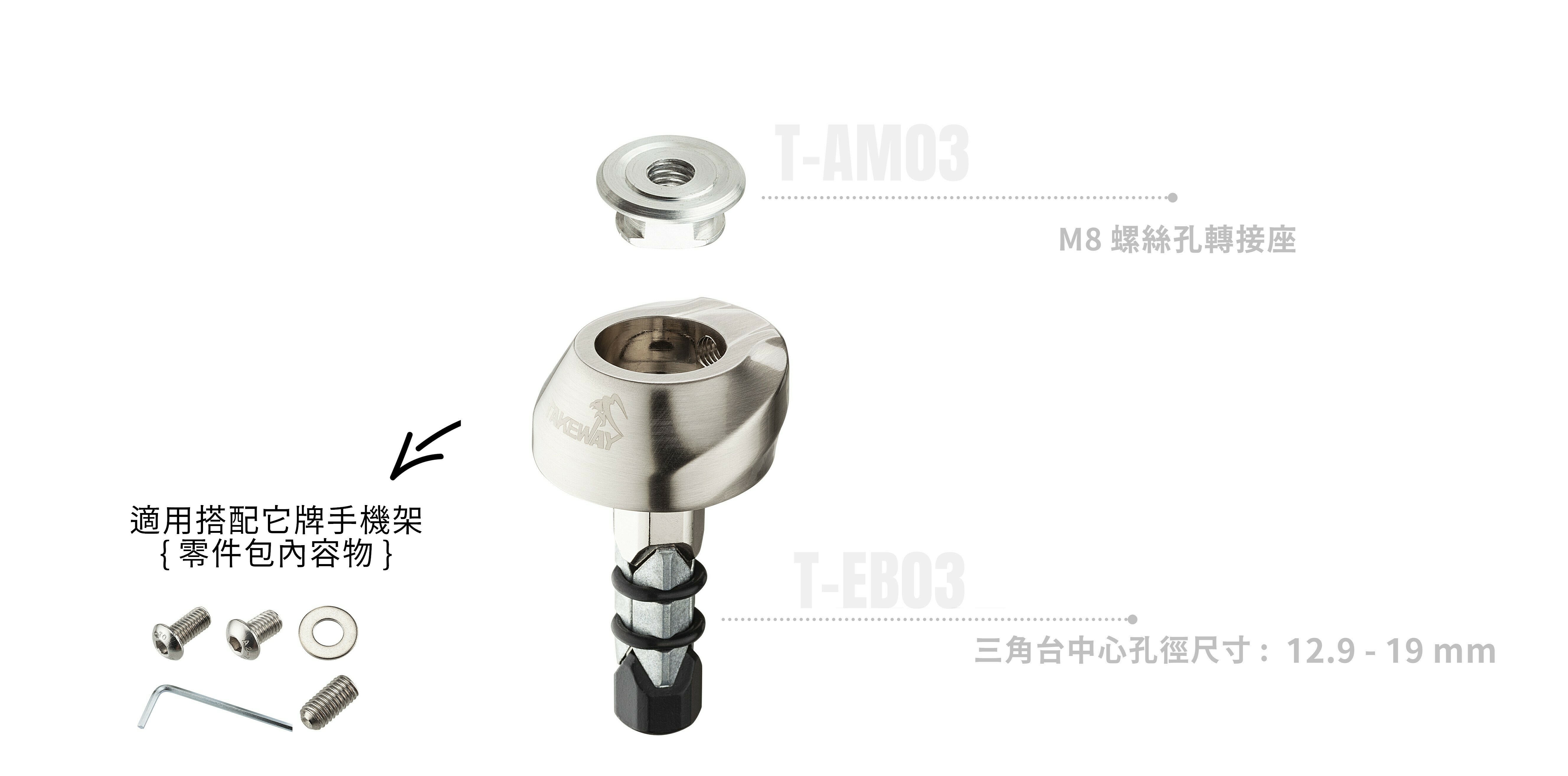 • 使用M8螺絲孔轉接座, 適用搭配它牌手機架