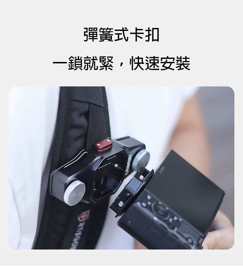 • 一鎖就緊,快速拆装彈簧式卡扣,一鎖就緊,可快速拆装相机