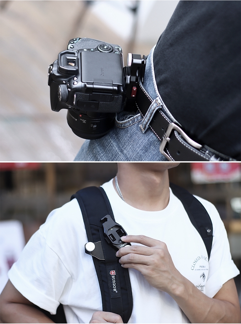 • 適用場景適用於背包肩带、皮帶等,最大支持長6.5cm厚1.5cm5,快速拆裝相機收掛與1秒快速切换"