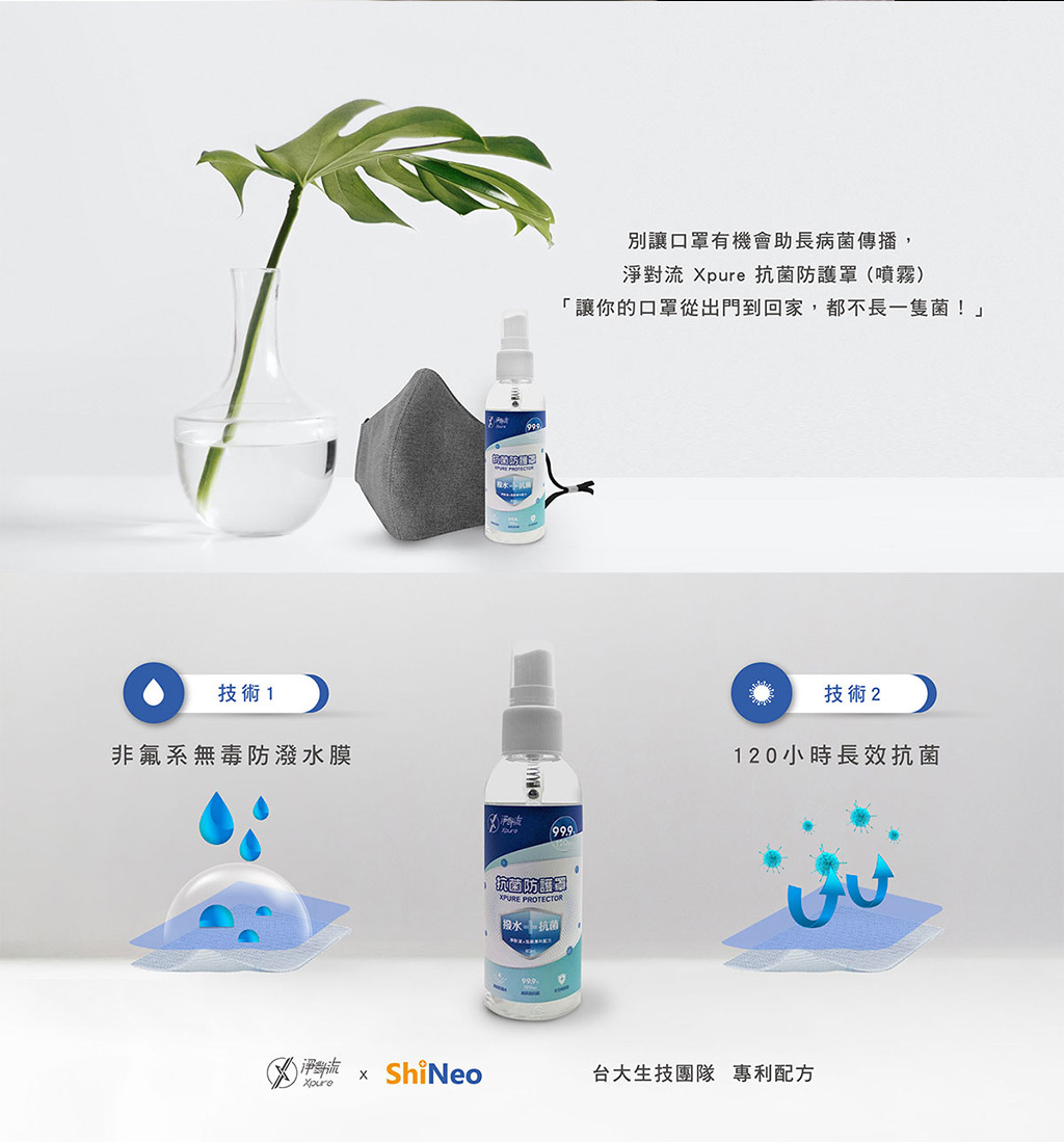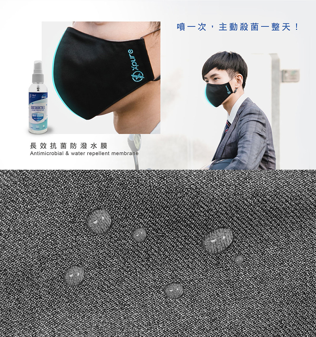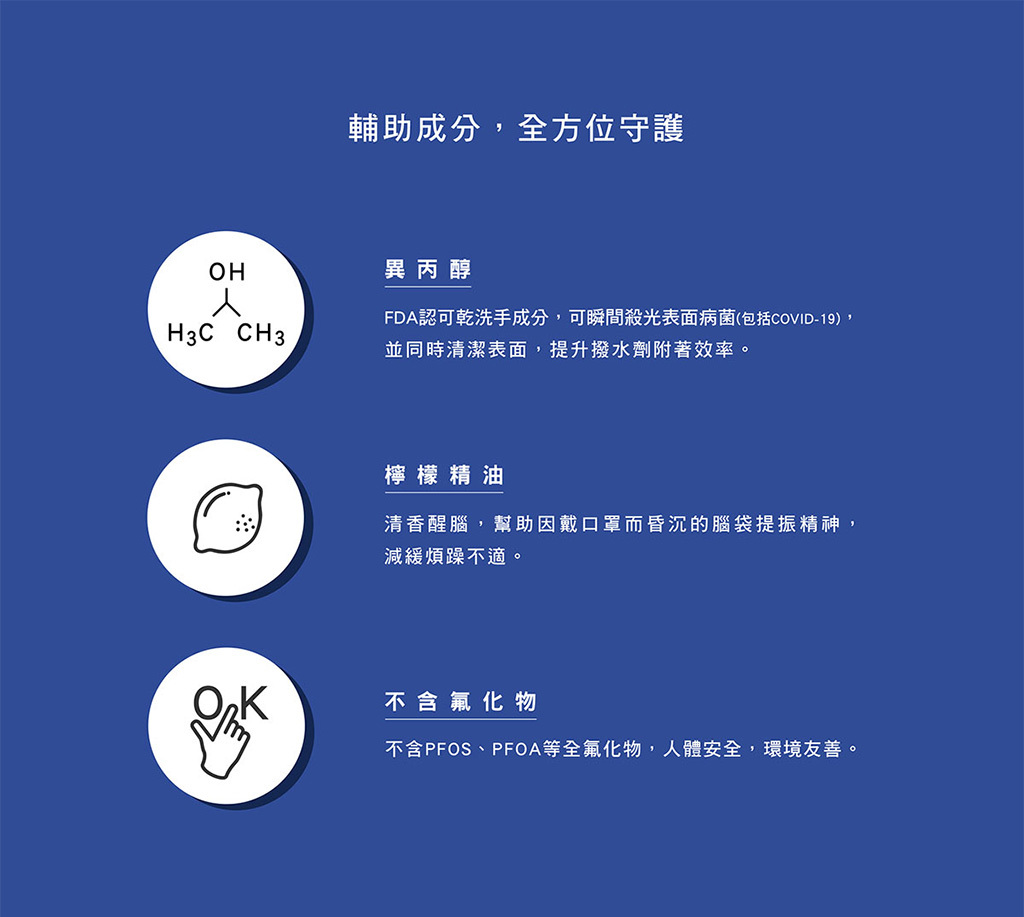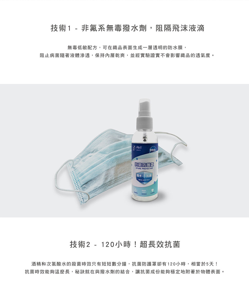 • 非氟系無毒防潑水劑,阻隔飛沫液滴