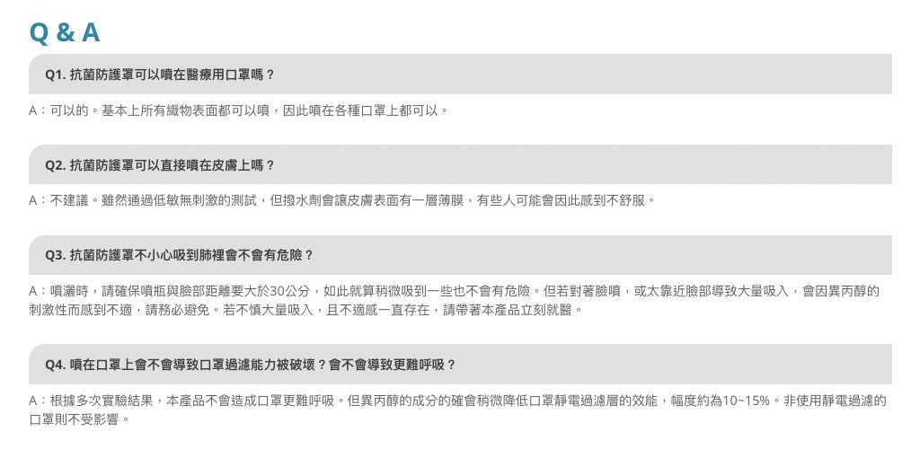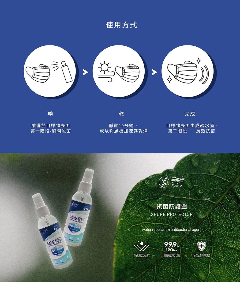 • 用法:預離目標物15公分,一個口罩的面積約噴灑兩到三次,噴完靜置五分鐘待其乾燥即可。