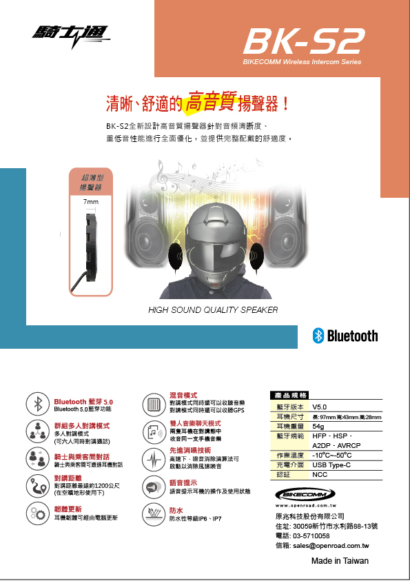 騎士通BK-S2 安全帽藍牙耳機 商品特色: