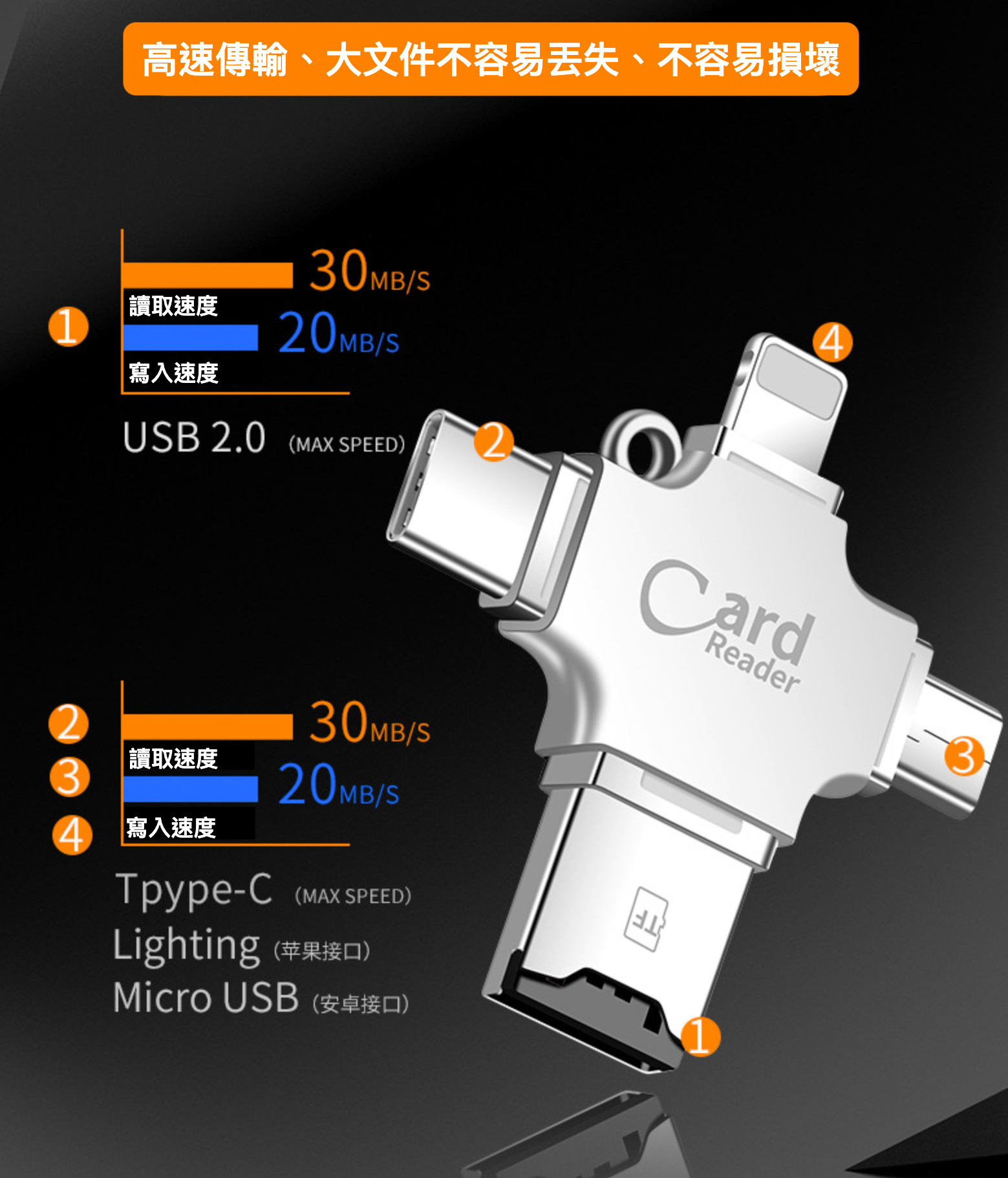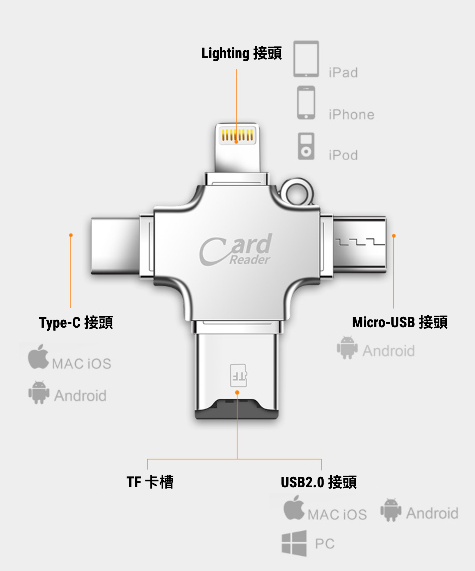 • 接口類別:Lightning(Apple蘋果)、Android、Type-C、USB 2.0、microSD記憶卡槽