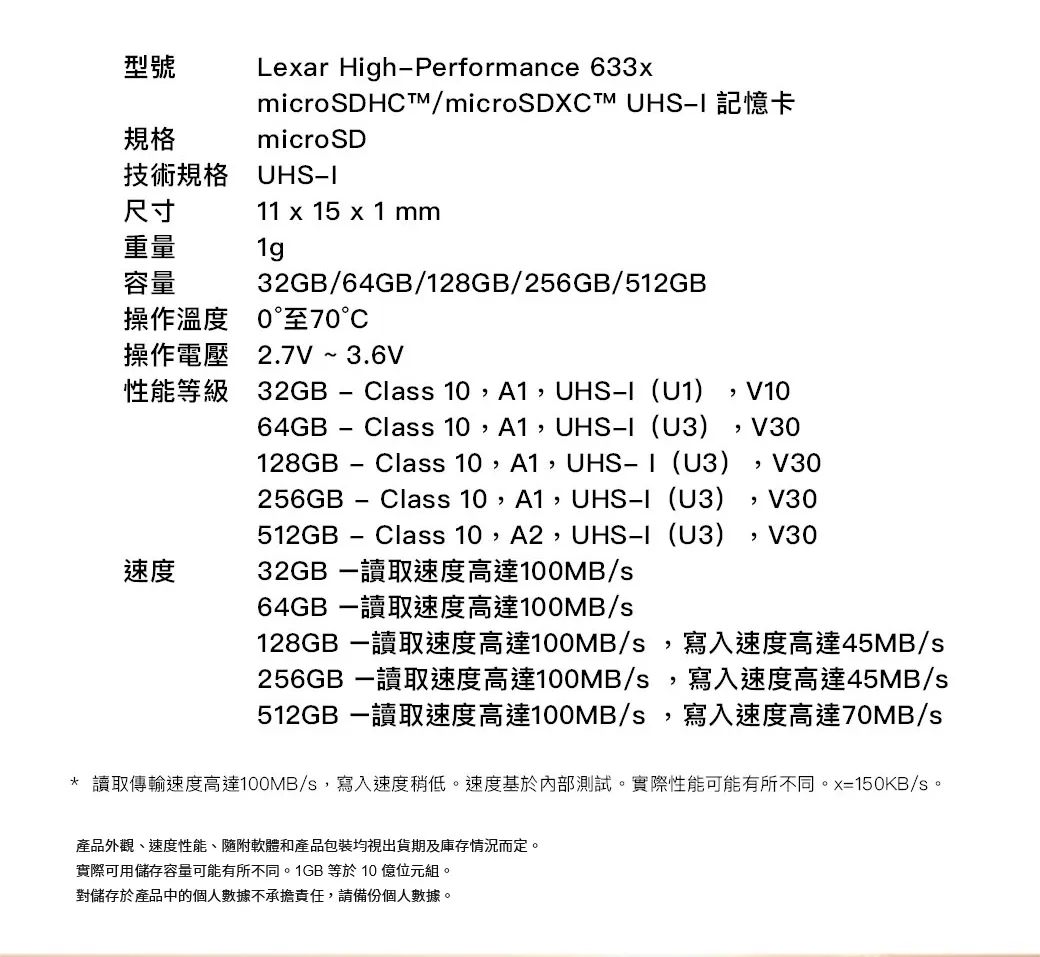 • Lexar 雷克沙 633x microSDHC UHS-I A1 U1 128G 記憶卡 x1