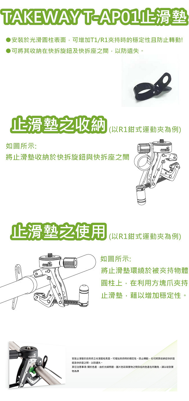 • 搭配TAKEWAY鉗式腳架、鉗式運動夾使用。