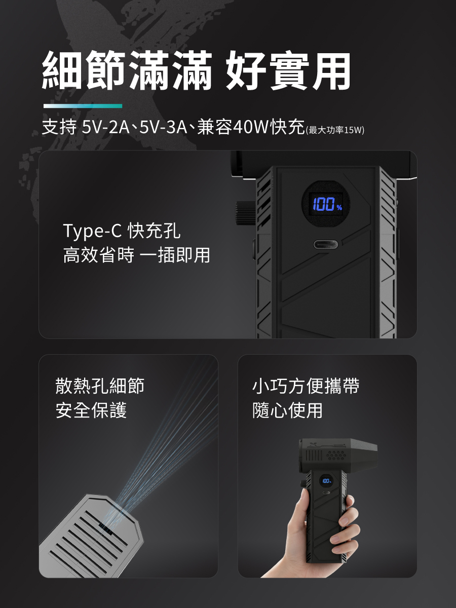 • 即時顯示 電量風量,使用狀況一目瞭然